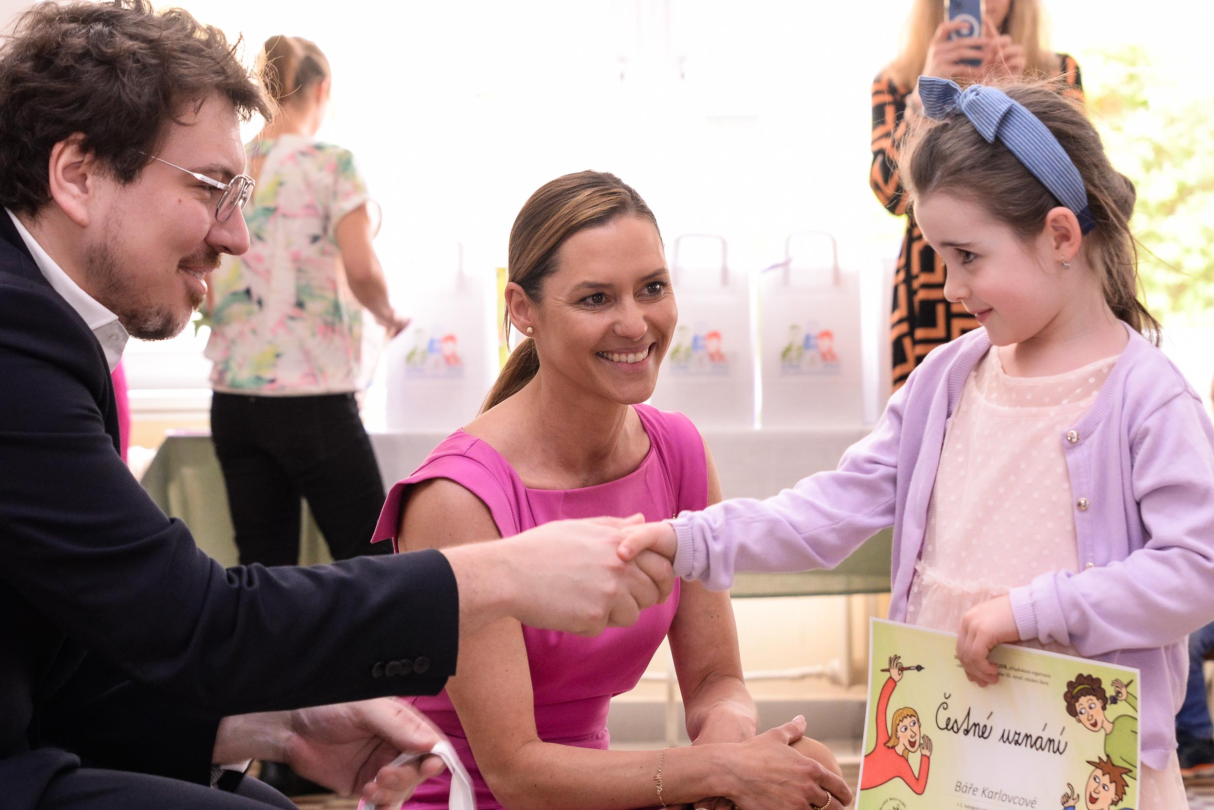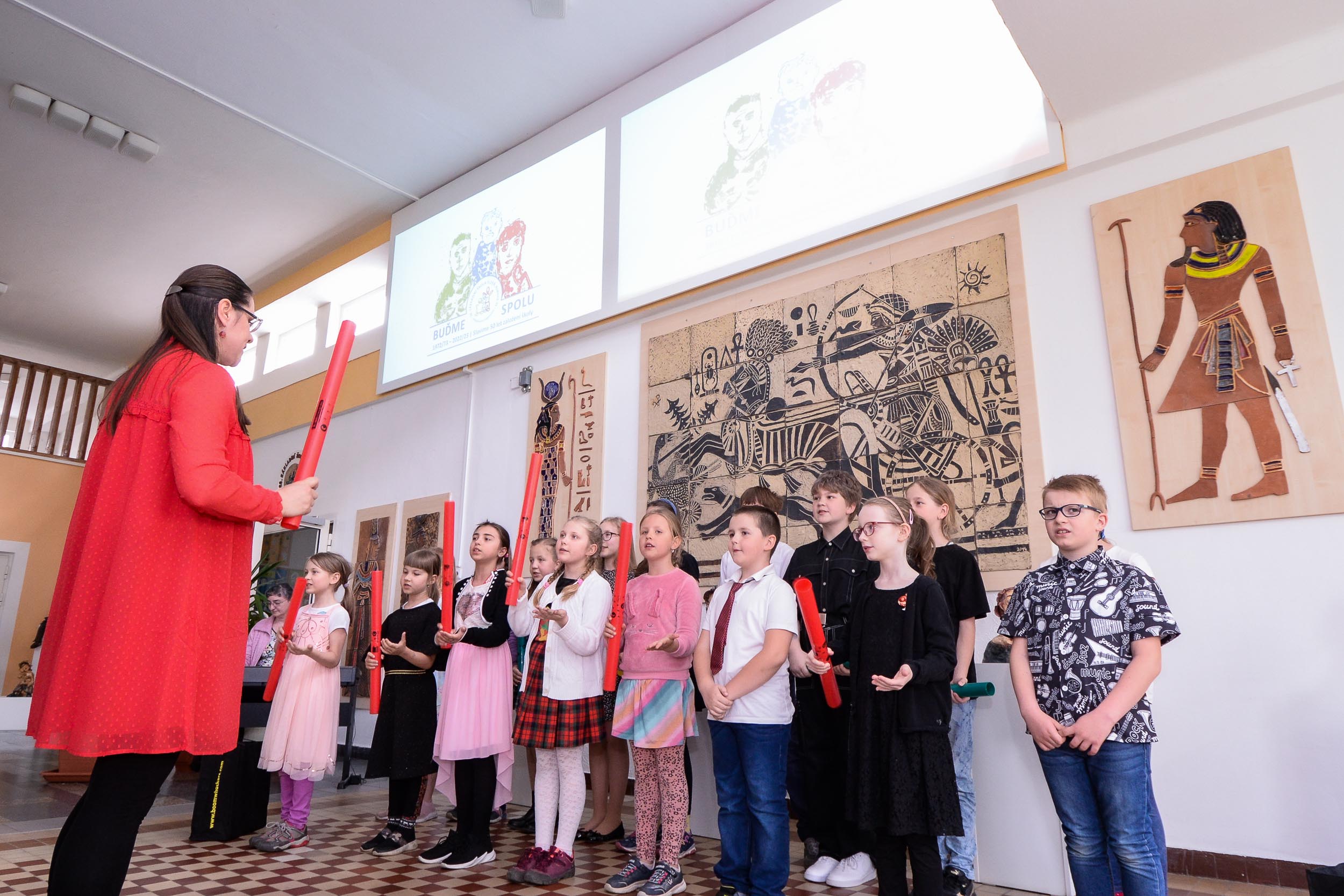 Škola na výročí připravila bohatý program. Vystoupil třeba školní sbor s písní Stromy od Uhlíře a Svěráka nebo dětský sbor Jiřičky. Lucie Kantorová společně se starostou čtvrtého obvodu Tomášem Soukupem předali dětem ocenění účastníkům výtvarné soutěže „Buďme spolu“.