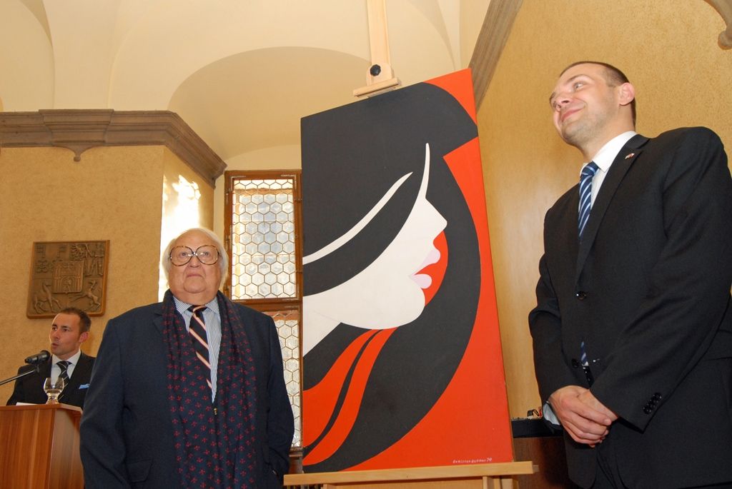 Slavnostní ceremoniál sledoval syn Ladislava Sutnara Radoslav. „Tatínek rád pracoval v několika krocích. Nejprve vypracoval tužkou kresbu, která byla základní skicou. Poté obvykle přešel na větší formát, a pokud se mu dílo stále zamlouvalo, vytvořil ho ještě větší. Před dvěma roky jsme věnovali takto vyvedenou studii Venuše městu. Později jsem zaznamenal, že je v jisté oblibě především u žen, které nosí na krku šátek s tímto grafickým motivem. A když už se blíží rok 2015, měli byste zde mít tu pravou Venuši ve skutečné velikosti. Proto vám s velkou radostí věnuji Venuši, jež se původně jmenovala Venuše s havraními vlasy. My jsme ji ale přejmenovali na Venuše/Plzeň je žena,“ pronesl a předal primátorovi originál obrazu jako symbol návratu svého otce do rodného města.