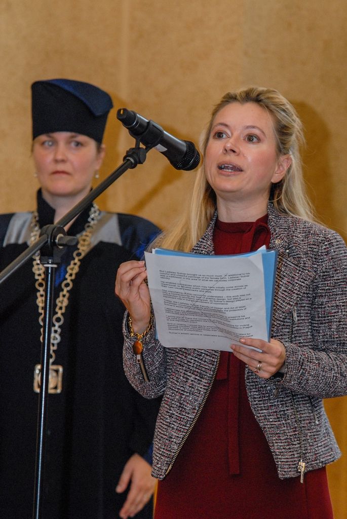 „Ráda bych poděkovala Fakultě designu a umění Ladislava Sutnara a především jejímu děkanovi Josefu Mišterovi, který s urputností sobě vlastní již několik let navrací Ladislava Sutnara a jeho dílo, které bylo minulým režimem po roce 1948 programově vymazáno z paměti naší společnosti, zpět do své vlasti, do svého rodného města,“ řekla Eva Herinková.