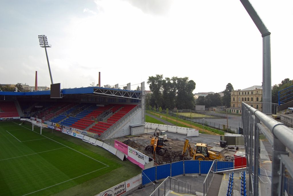 Projektovou dokumentaci pro stavební povolení si odbor správy infrastruktury magistrátu, který se o plzeňská městská sportovní zařízení stará, nechal zpracovat podle aktuálního požadavku UEFA na jaře letošního roku. Část tribuny v jižním bloku se nemohla stavět dříve kvůli původnímu příhradovému stožáru osvětlení. „Stavbě překážel především mohutný základ stožáru, který se nyní odstraňuje,“ upřesňuje Veronika Krupičková z odboru správy infrastruktury. Původní stěžeň byl sice demontován a nahrazen dvěma novými stožáry na osvětlení loni v létě, k likvidaci jeho podkladu ale dochází až nyní.
