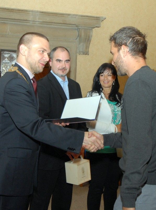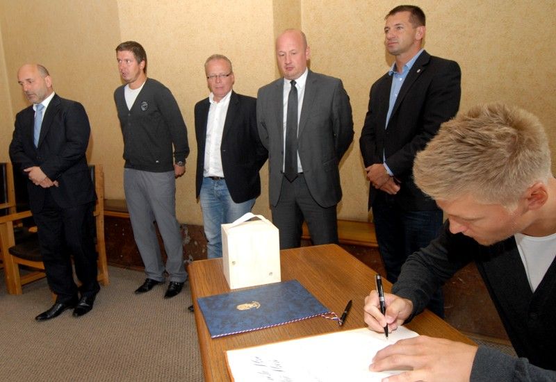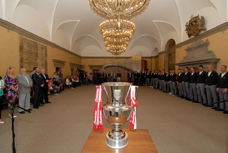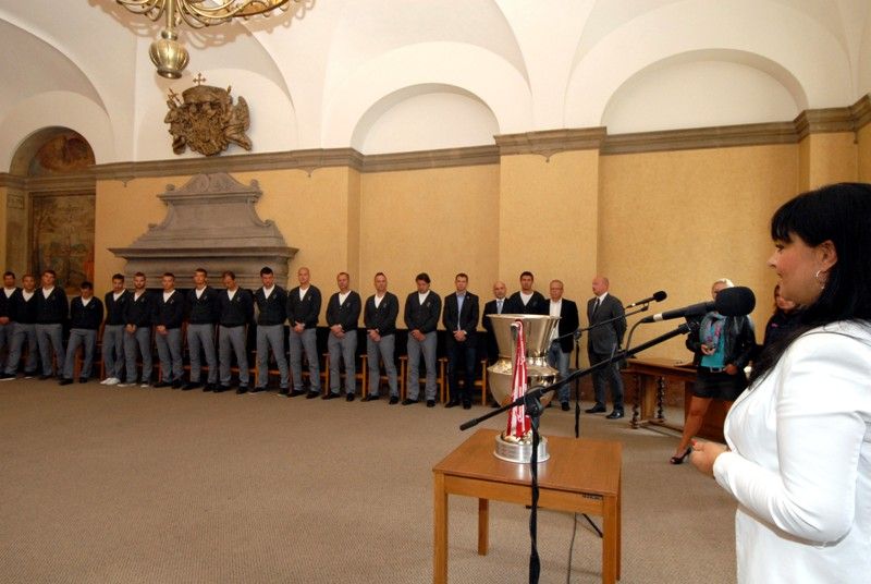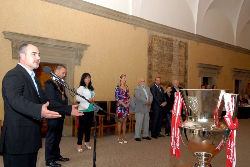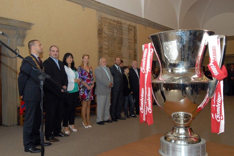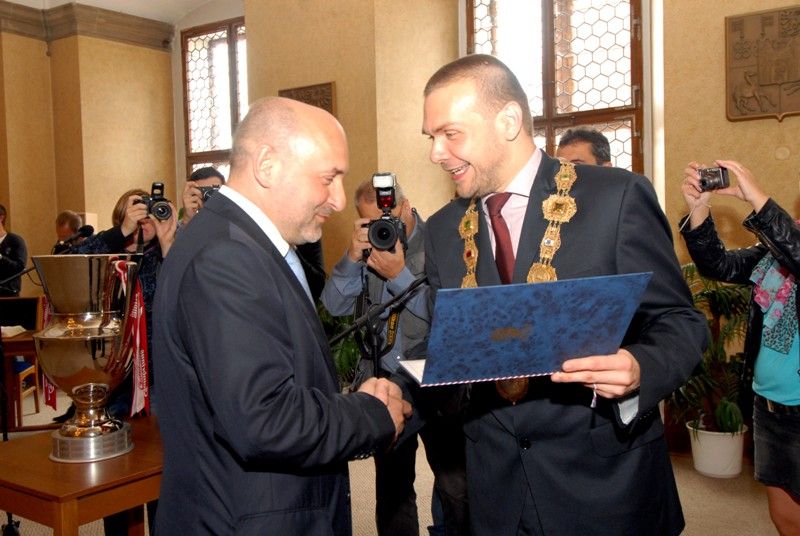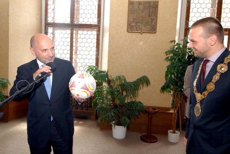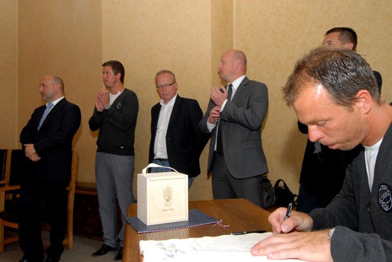 Hráči a členové realizačního týmu obdrželi pamětní listy, vzácnou trofej - míč, se kterým mužstvo hrálo evropskou ligu, si ze setkání naopak odnesl primátor Martin Baxa.