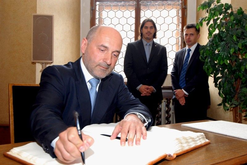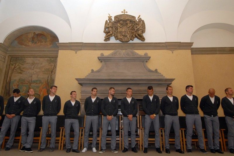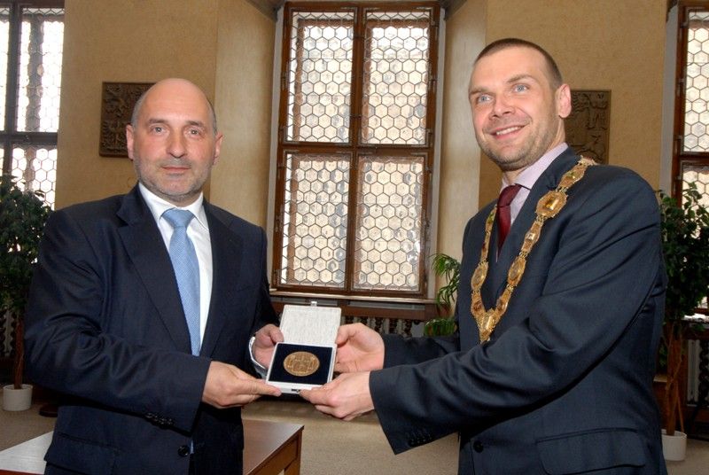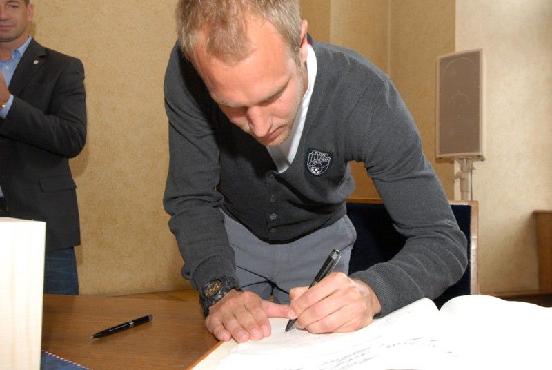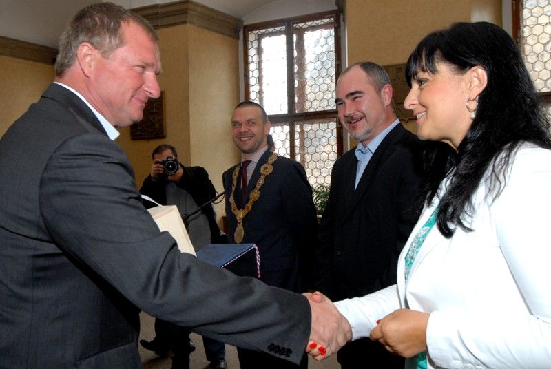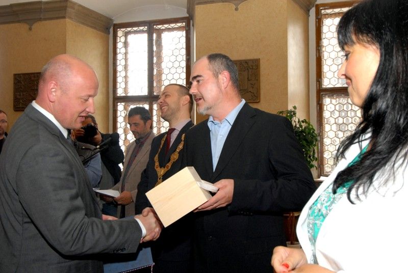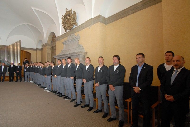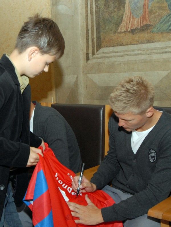 Hráči a členové realizačního týmu obdrželi pamětní listy, vzácnou trofej - míč, se kterým mužstvo hrálo evropskou ligu, si ze setkání naopak odnesl primátor Martin Baxa.