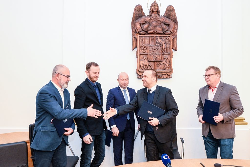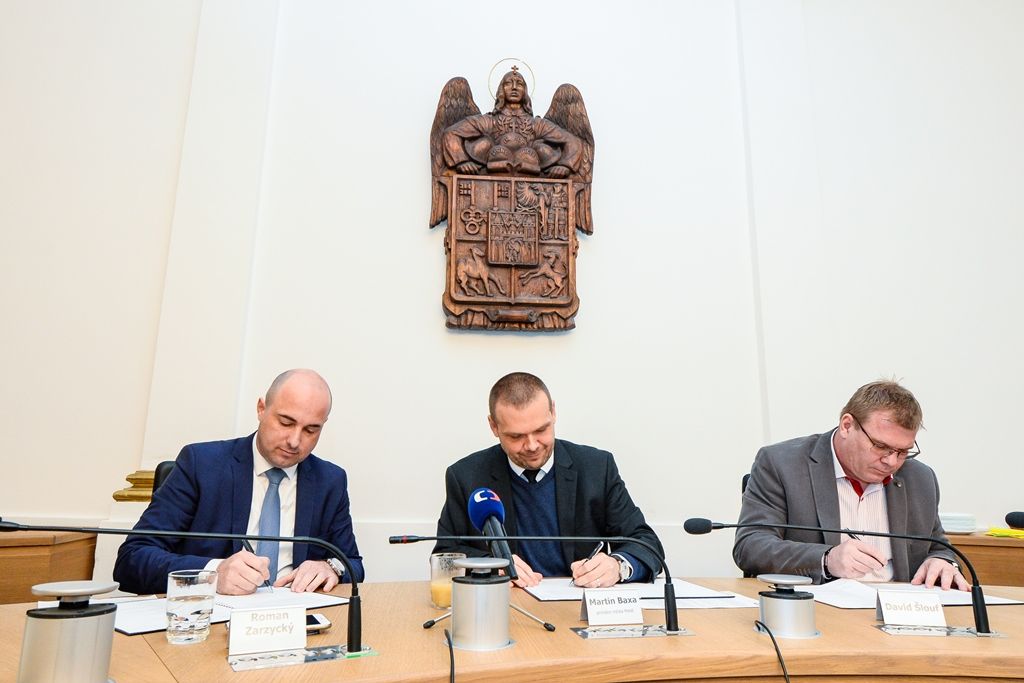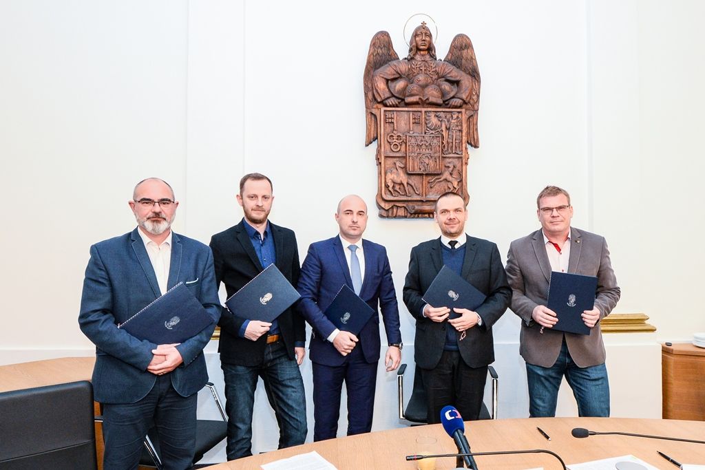 Programové prohlášení podepsali (zleva): za ČSSD Martin Zrzavecký, za TOP 09 Petr Suchý, za ANO 2011 Roman Zarzycký, primátor Martin Baxa (ODS), za ODS David Šlouf