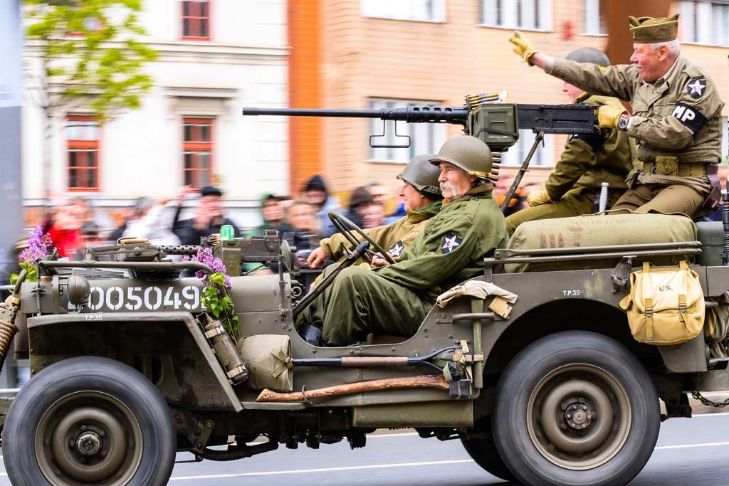 Lidé mávali americkými, českými i belgickými vlaječkami osazenstvu vojenských vozů a zdravili jej. Největší ovace si vysloužily vozy, v nichž se vezli američtí a belgičtí veteráni, kteří se zúčastnili osvobozování Plzně před 74 lety a letos opět přijeli i s rodinnými příslušníky. Přihlížející z vozidel zdravili američtí veteráni George Thompson z 16. obrněné divize, Earl Ingram, Herman Geist a James Duncan z 2. pěší divize americké armády, Richard Pieper a Fremont Gruss z 97. pěší divize. Nechyběli ani belgičtí veteráni Louis Gihoul, Hubert Rauw, Valère Gustin a Michel Gilain. V konvoji jel i vnuk generála Pattona George Patton Waters, Luc Rensonnet, syn již zesnulého velitele belgického 17. dělostřeleckého pluku. Zúčastnili se i čeští veteráni – Josef Švarc z Československé samostatné obrněné brigády a přímý účastník obléhání francouzského přístavu Dunkerque v roce 1944, a také Tomáš Lom, příslušník 311. bombardovací perutě RAF.