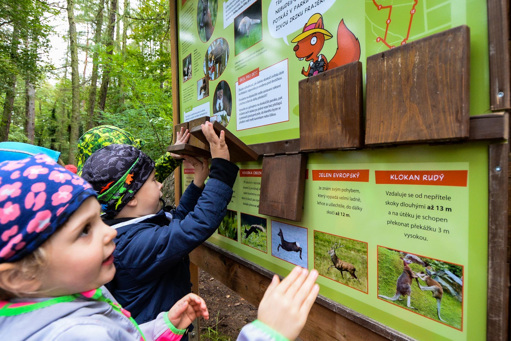 Děti si také na doplňkových ilustracích mohou procvičit svůj postřeh při hledání rozdílů a nakreslených zvířátek nebo procvičit počítání. Na otáčecích kostkách a destičkách pak třeba určí druhy motýlů, ptáků nebo stromů. Cestou lesoparkem si mohou vyzkoušet, jak daleko doskočí ve srovnání se zvířaty na nově upravené ploše doskočiště.