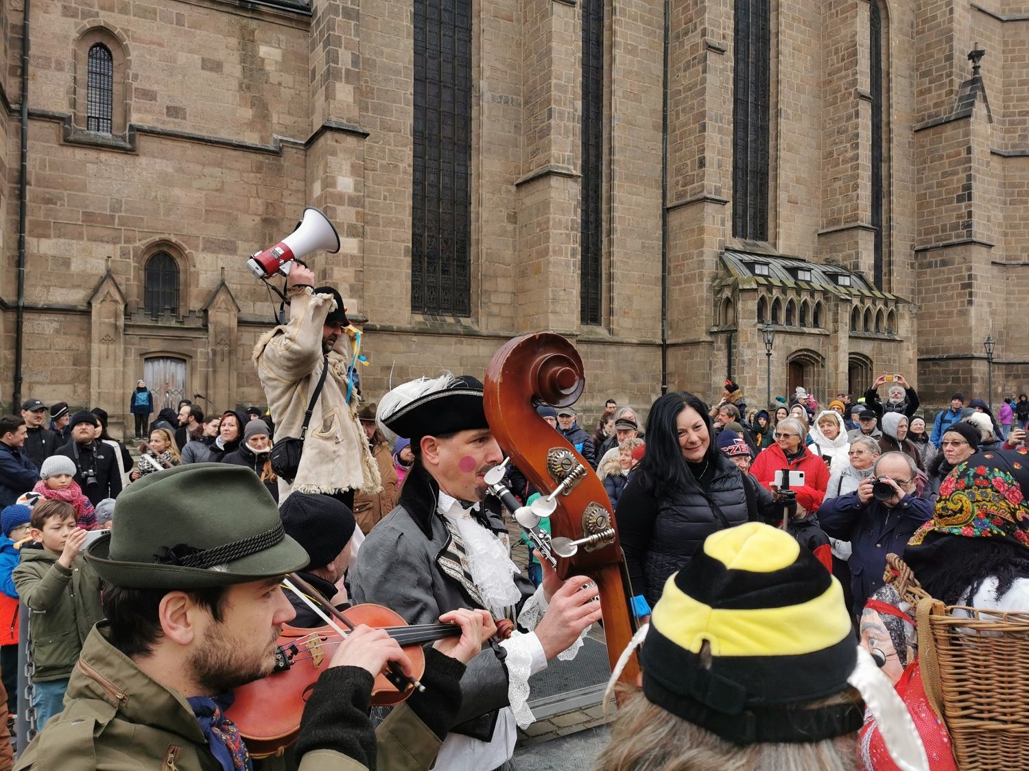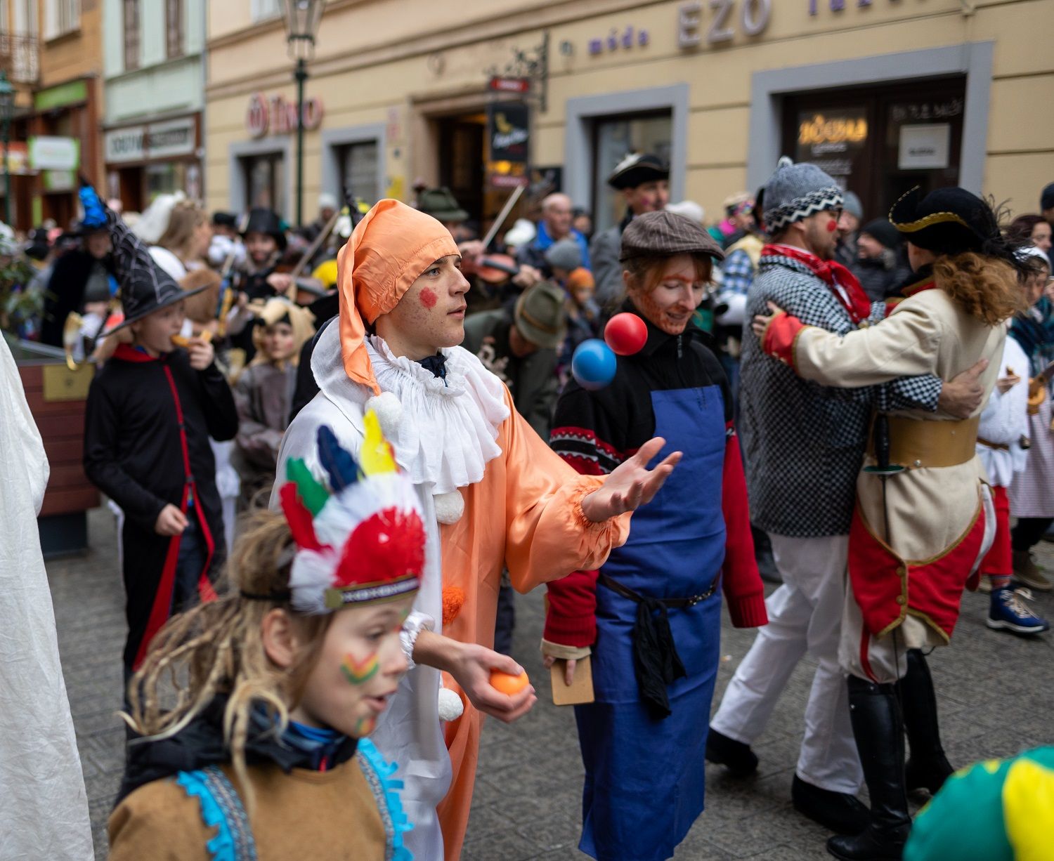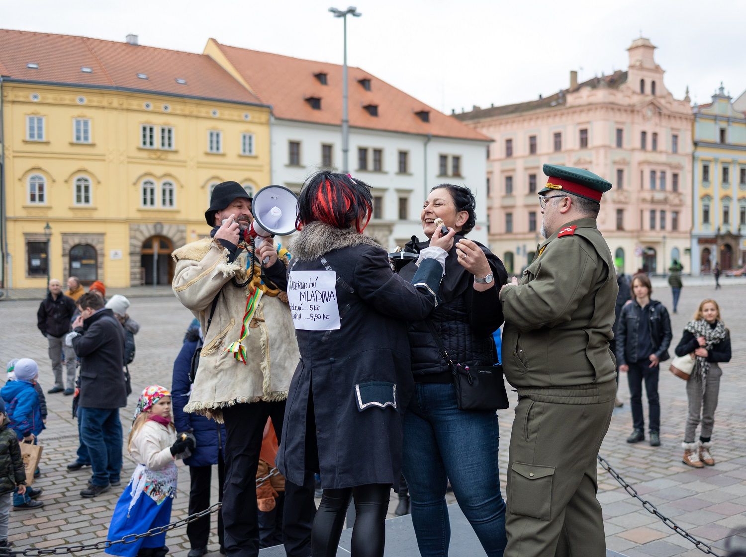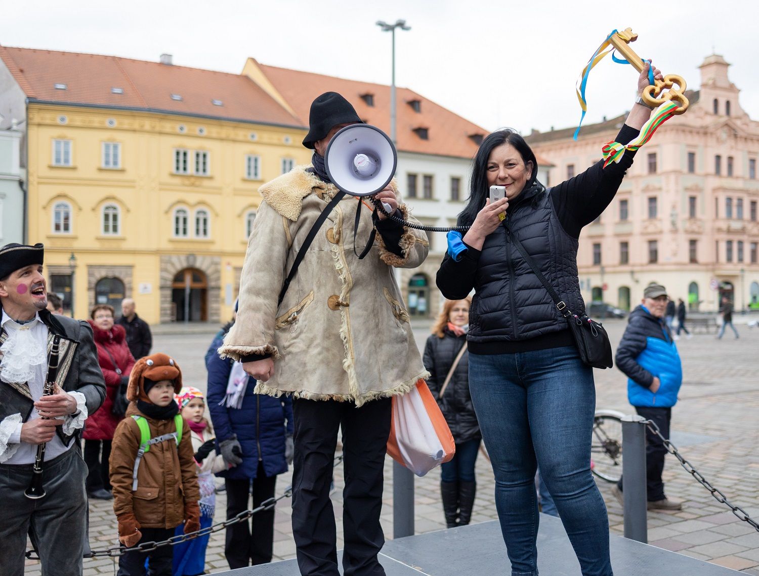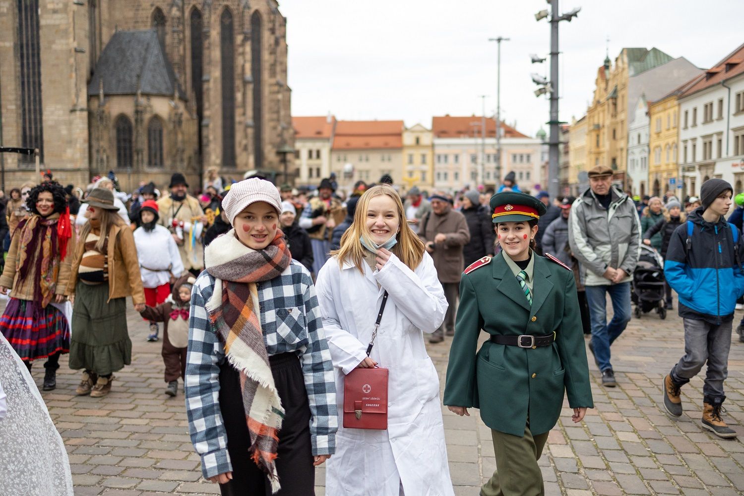 „Z pozice radní města vám dávám svolení k masopustnímu veselí. Předávám vám klíč k městským branám a prosím vás, spravujte naši Plzeň dobře a užijte si masopustní radovánky. Dnes k vám všem v průvodu mám ještě jednu velkou prosbu, hlídejte v našem městě svobodu a myslete na Ukrajinu,“ řekla Veronika Jilichová Nová před radnicí.
