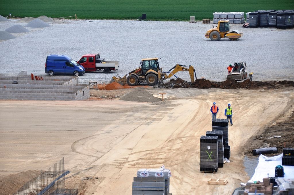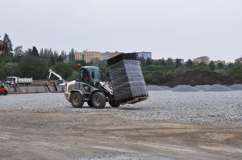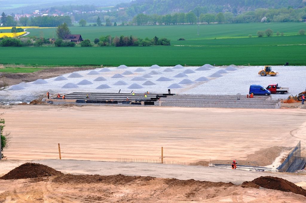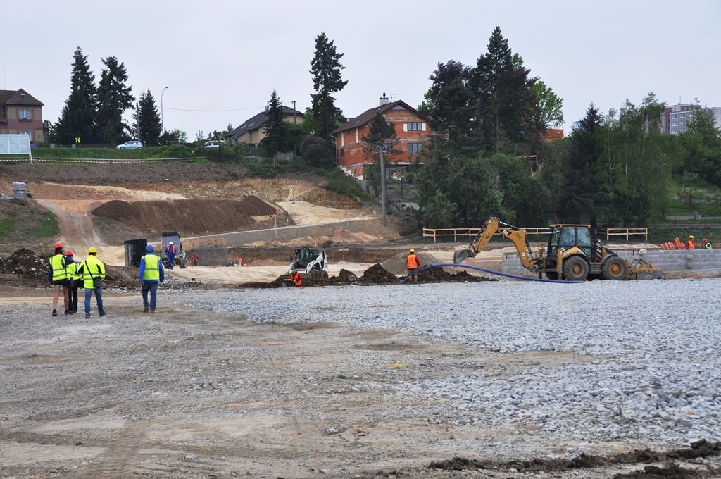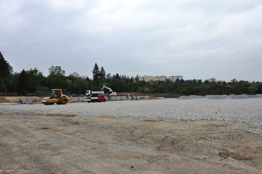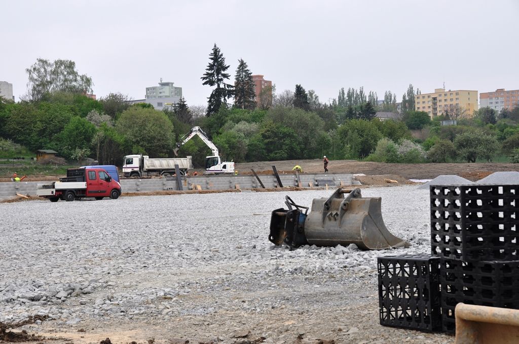 „Dodavatel nyní dokončuje hrubé terénní úpravy a dělá základy pro přízemní provozní budovu. Ta se bude skládat z celkem 33 k sobě seskládaných vybavených buněk neboli kontejnerů, hotová včetně fasády by měla být do konce prázdnin. Co se týká hřišť, jejichž povrch bude tvořit přírodní setá tráva, tak je nyní na řadě odvodnění a příprava konstrukční vrstvy pro zasetí trávy,“ přiblížil technický náměstek primátora Pavel Šindelář. Pro zatravnění je potřeba tříměsíční lhůta, což je čas nutný pro to, aby byla tráva schopna zátěže. V souvislosti s výstavbou náhradního hřiště už byla zrekonstruována příjezdová komunikace.