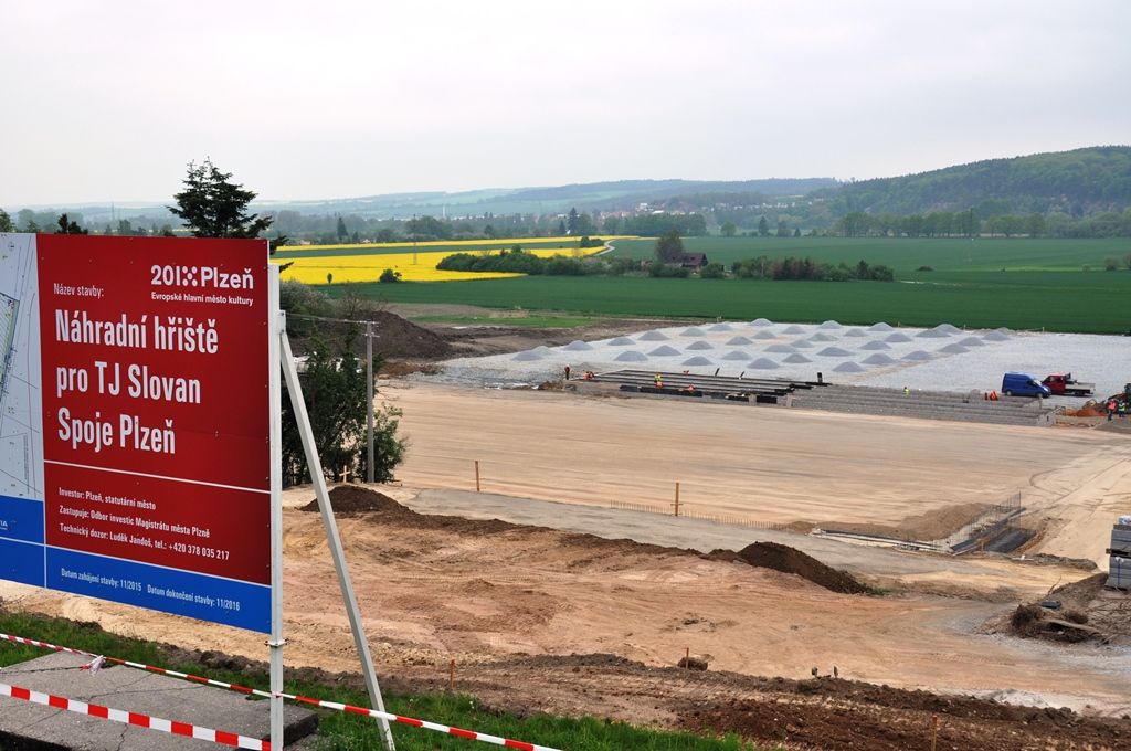 Hlavní hřiště, tréninkovou plochu i provozní objekt s kancelářemi, kabinami, šatnami a dalším zázemím včetně tribuny pro 300 lidí buduje ve Skvrňanech při výjezdu na Křimice město Plzeň. Sportovní areál na ploše zhruba 2,4 hektaru poslouží jako náhradní hřiště pro TJ Slovan Spoje Plzeň. Město předalo dodavateli staveniště loni v listopadu, komplex s hřišti o rozměrech 110 krát 73 metrů a 93 krát 53 metrů by měl být uveden do zkušebního provozu v září, kolaudace je v plánu v polovině listopadu. Smluvní cena projektu je 37,7 milionu korun bez DPH.