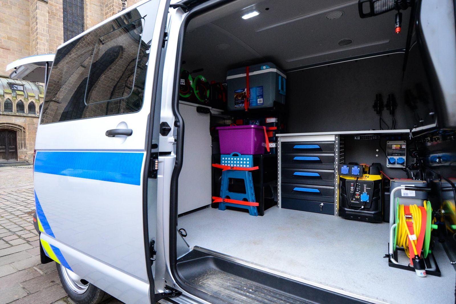 Nové vozidlo tovární značky VW Transporter je vybaveno speciálně pro potřeby policie. Disponuje světelným i zvukovým výstražným zařízením a dalšími doplňkovými výstražnými svítilnami. Do výbavy vozu patří box na kontaminovaný odpad, elektrocentrála, pětilitrový kanystr, AKU šroubovák a inspekční kamera, dále horkovzdušná pistole, úhlová bruska, krumpáč, sekera, pákové kleště, rošt na popel, detektor kovů, teleskopický žebřík nebo světelná souprava.