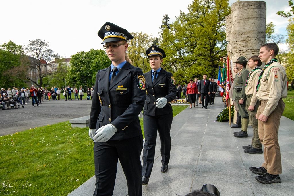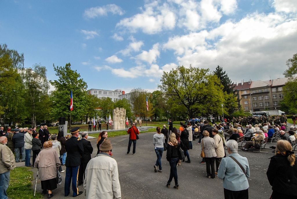 V odpoledních hodinách si pak Plzeň připomněla válečné oběti postupně u třech památníků. Bojovníky a oběti válek a současně padlé československé a spojenecké letce uctili zástupci města v čele s primátorem Plzně Martinem Zrzaveckým, významní hosté, veteráni a desítky Plzeňanů na náměstí Míru. Květiny a věnce položili u památníku, jenž symbolicky připomíná hrob osmi tisíc Plzeňanů bojujících za svobodu. Ve chvíli, kdy u památníku položili věnec také veteráni, lidé tleskali. „Jsem přesvědčen, že jediná cesta, která může udržet mír, je cesta rozumu, poctivého myšlení, vzdělání, vzájemné otevřenosti, víry v budoucnost i v sebe sama. A především je to cesta obyčejné dobré vůle. Dobré vůle, kterou by mělo být prodchnuto naše konání. Je to cesta dlouhodobá, ale jediná možná. Myslím, že tím nejlépe dokážeme uctít památku všech obětí válek, a na druhé straně i všech hrdinů, kteří se za náš lepší život, za náš život v míru a ve svobodě obětovali – ať již to byli Plzeňané, příslušníci domácího odboje, zahraničního odboje, anebo vojáci armády Spojených států amerických. Kvůli tomu jsme se tu dnes, na náměstí Míru, společně sešli,“ uvedl první náměstek primátora města Plzně Martin Baxa, který měl u prvního pietního aktu projev.