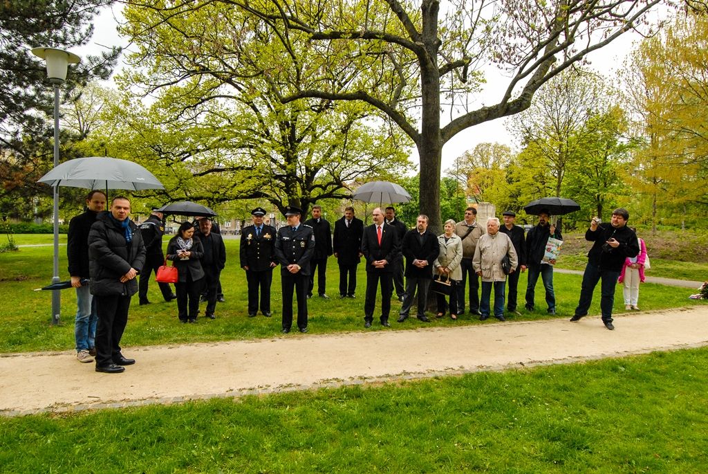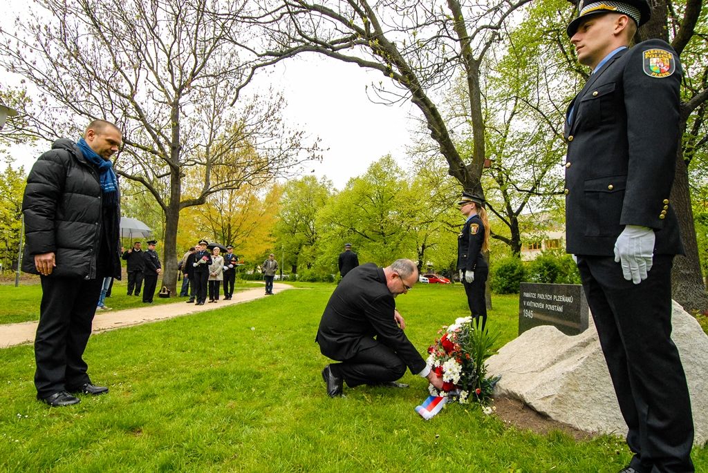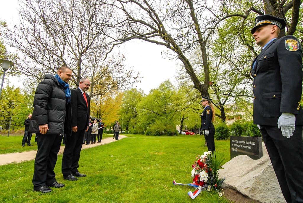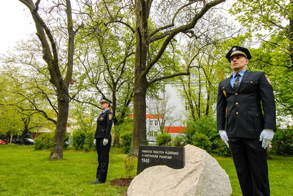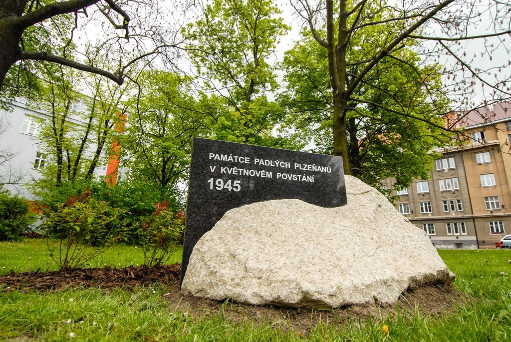 Položit květiny u nově vybudovaného pomníku, jenž je věnován památce padlých Plzeňanů v květnovém povstání roku 1945, se rozhodli představitelé města Plzně, městské a státní policie. Nedávno dokončený památník tvoří upravený přírodní balvan nepravidelného formátu z místního kamene, do kterého je vložena kamenicky opracovaná leštěná deska. Umístěn je na náměstí Míru v blízkosti Purkyňova pavilonu. Vybudovat ho nechalo město prostřednictvím Správy veřejného statku města Plzně, podnět vzešel od zastupitelů v čele s Janou Bystřickou. Z vedení radnice se vzpomínkového setkání zúčastnili primátor města Martin Zrzavecký a jeho první náměstek Martin Baxa.