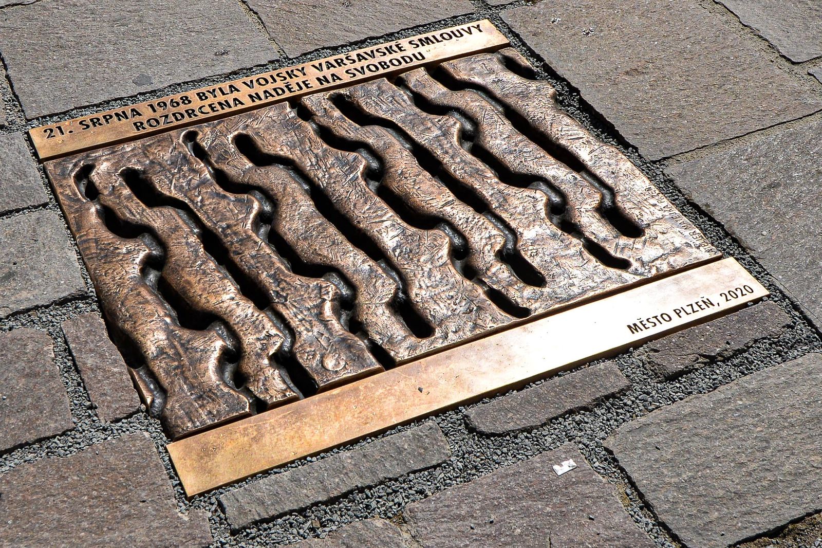 Bronzová deska s motivem stopy tankového pásu je osazena do úrovně dlažby náměstí Republiky, kde nejlépe evokuje násilný vpád vojsk pěti komunistických zemí na území Československa. Jedním z iniciátorů jejího vzniku je plk. v. v. Jan Kabát, předseda územního spolku Plzeň Vojenského spolku rehabilitovaných Armády České republiky.
