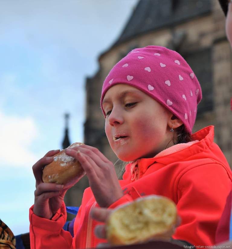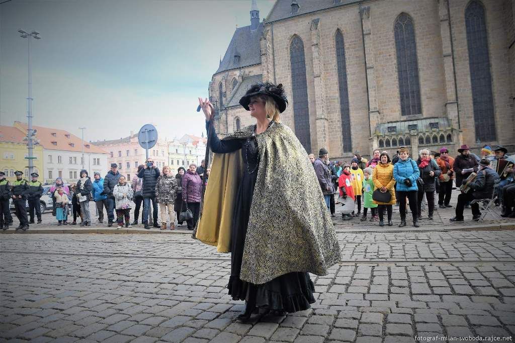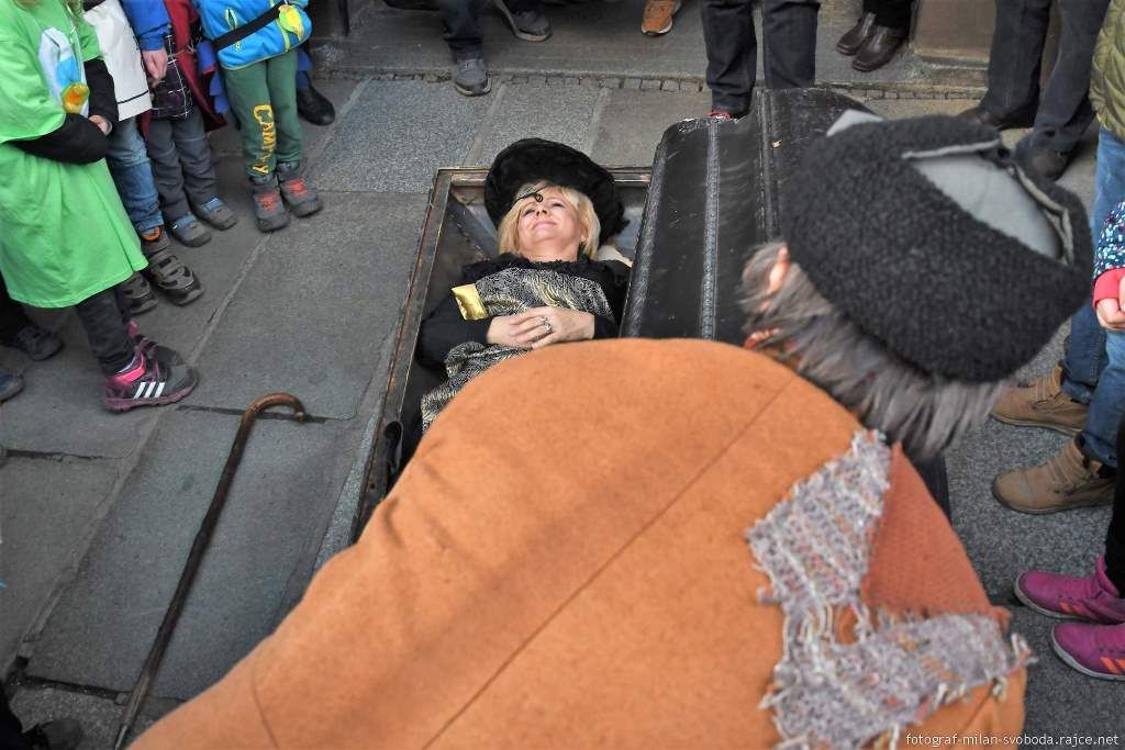Průvod došel až na prostranství před radnici na náměstí Republiky, kde je očekával primátor města Martin Baxa. Tomu Jaromil XI. předal hlášení o vyhnání zimy z plzeňské kotliny a společně uložili zimu do rakve. Program vyvrcholil soutěží v pojídání masopustních koblih Plzeňský koblížek o titul Koblížkového krále a prince.