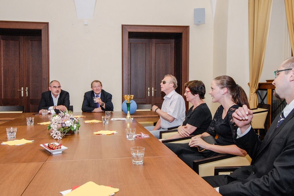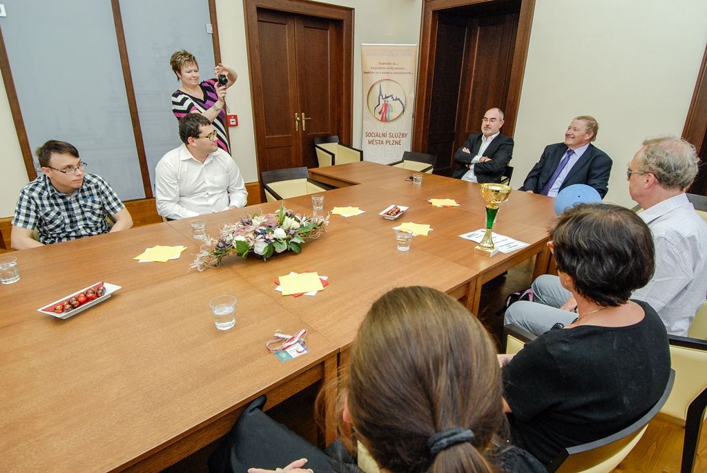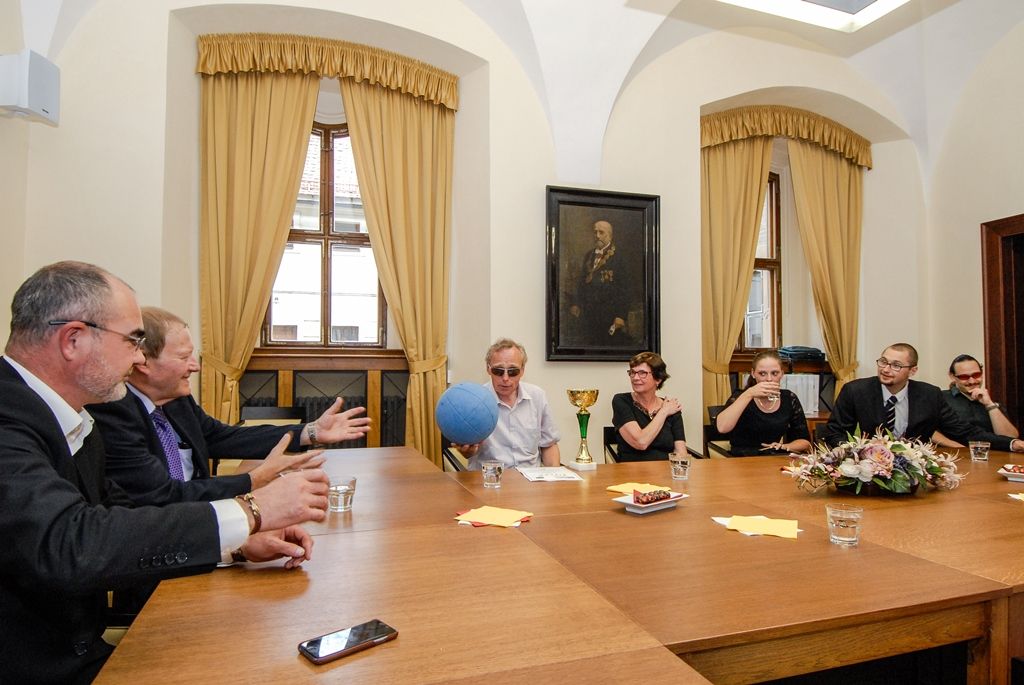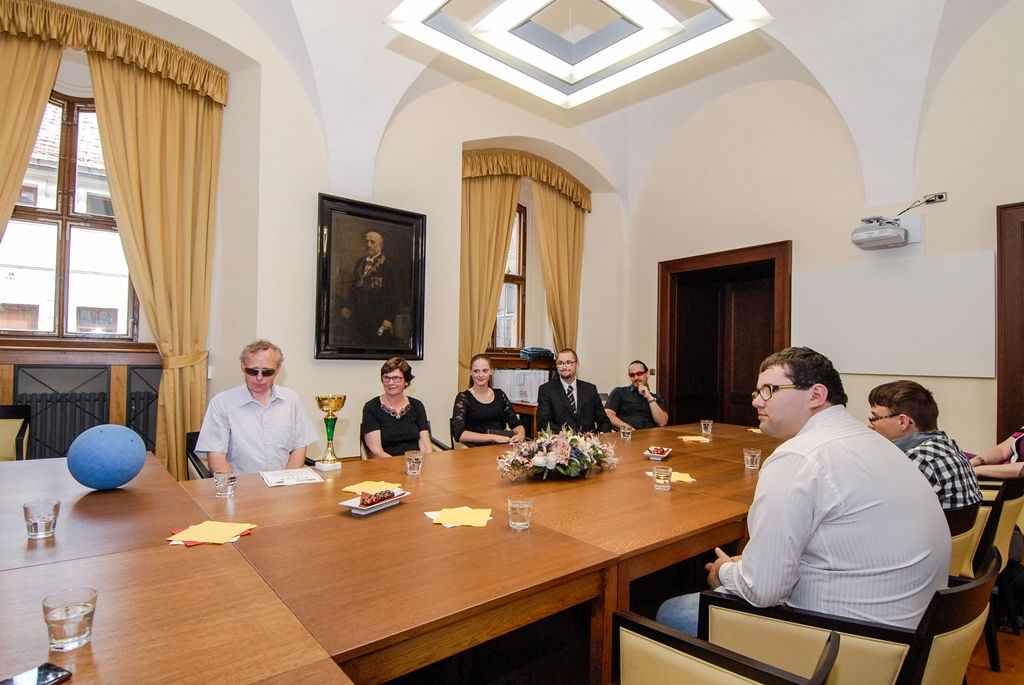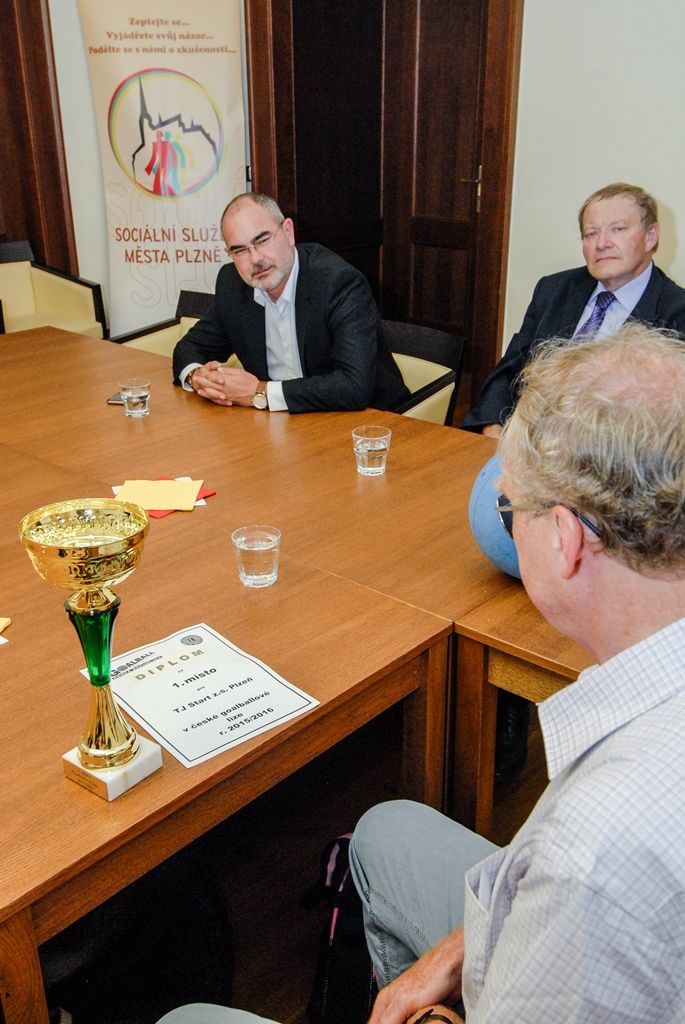 Zrakově postižení hráči goalballu z TJ Plzeň Start navštívili ve čtvrtek odpoledne plzeňskou radnici, za zisk mistrovského titulu v sezoně 2015/2016 jim poděkoval primátor města Martin Zrzavecký. Pět hráčů v doprovodu rodinných příslušníků a trenérky týmu seznámilo primátora s pravidly goalballu, speciálním míčem i brýlemi, které různě zrakově postiženým lidem nastavují stejné možnosti. Martin Zrzavecký se kromě jiného zajímal o asistenční psy a jejich výcvik, skupinu sportovců doprovázeli právě dva z nich.