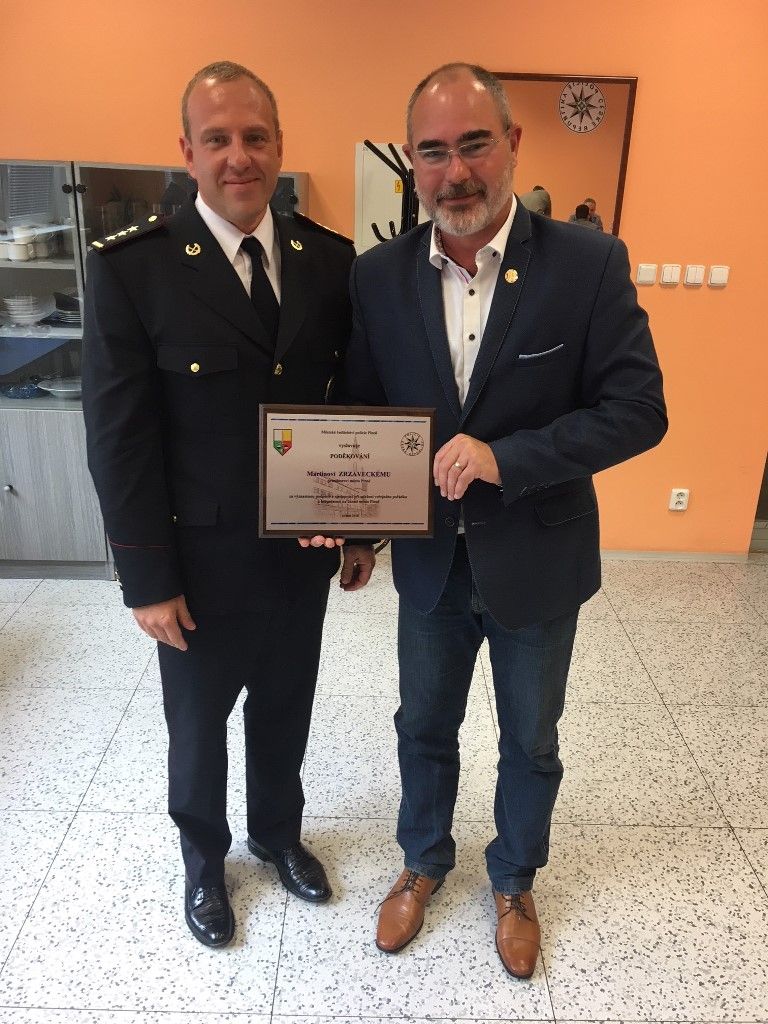 Pamětní plaketu jako poděkování za významnou a dlouhodobou podporu při udržení veřejného pořádku a bezpečnosti na území města Plzně si ve středu převzal primátor města Plzně Martin Zrzavecký. Plaketu mu předal ředitel Městského ředitelství policie Plzeň Michal Krejbich. Primátor se zúčastnil porady městského ředitelství policie, kde ocenil nadstandartní vzájemnou spolupráci a poděkoval policistům nejen za perfektní organizaci a zajištění klidného průběhu jedné z největších plzeňských akcí – Slavností svobody Plzeň 2018 neboli květnových oslav osvobození, ale také za dlouhodobou vysokou úroveň profesionality. Následně policisté s primátorem řešili problematiku výherních automatů a heren, nárůst počtu pracovních agentur či dopravní situaci v Plzni. Za město Plzeň se porady zúčastnil také vedoucí odboru bezpečnosti, prevence kriminality a krizového řízení Aleš Průša.