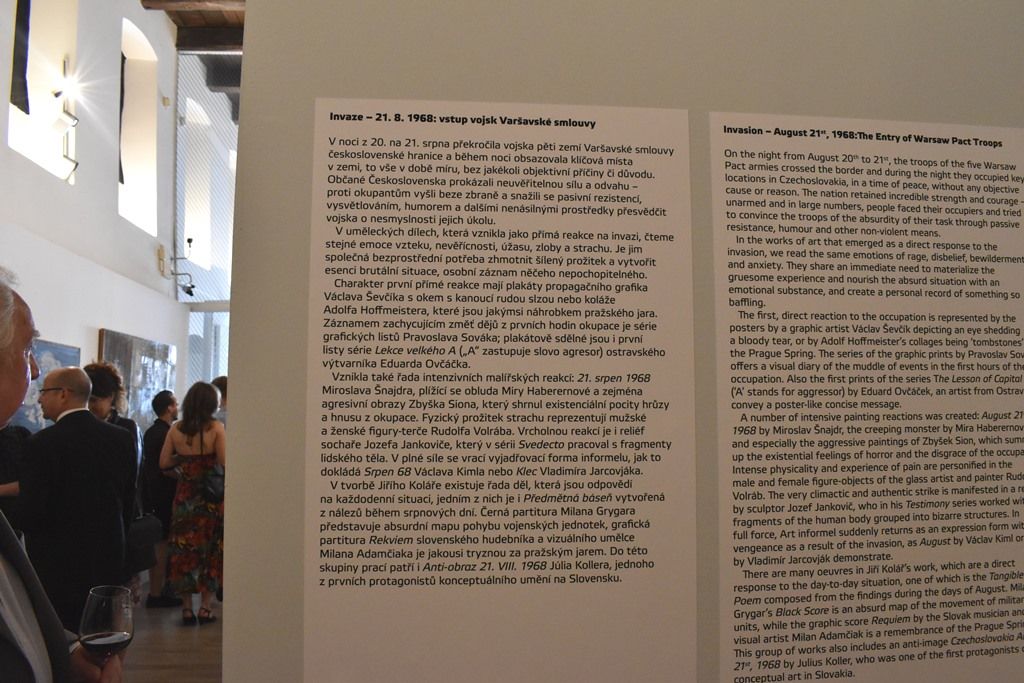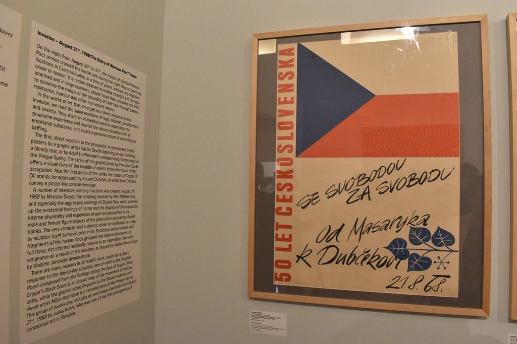 Návštěvníci v Masných krámech uvidí práce Jiřího Koláře, Zbyška Siona, Vladimíra Jarcovjáka nebo Julia Kollera. Absurditu okupace, šok a zklamání ukazují díla Karla Nepraše, Jitky a Květy Válových či Mikuláše Medka. Expozice také představuje práce, jež reagovaly na smrt Jana Palacha. Mezi nejznámější patří díla Olbrama Zoubka a Václava Boštíka nebo plastiky sochaře Zdeňka Šimka.