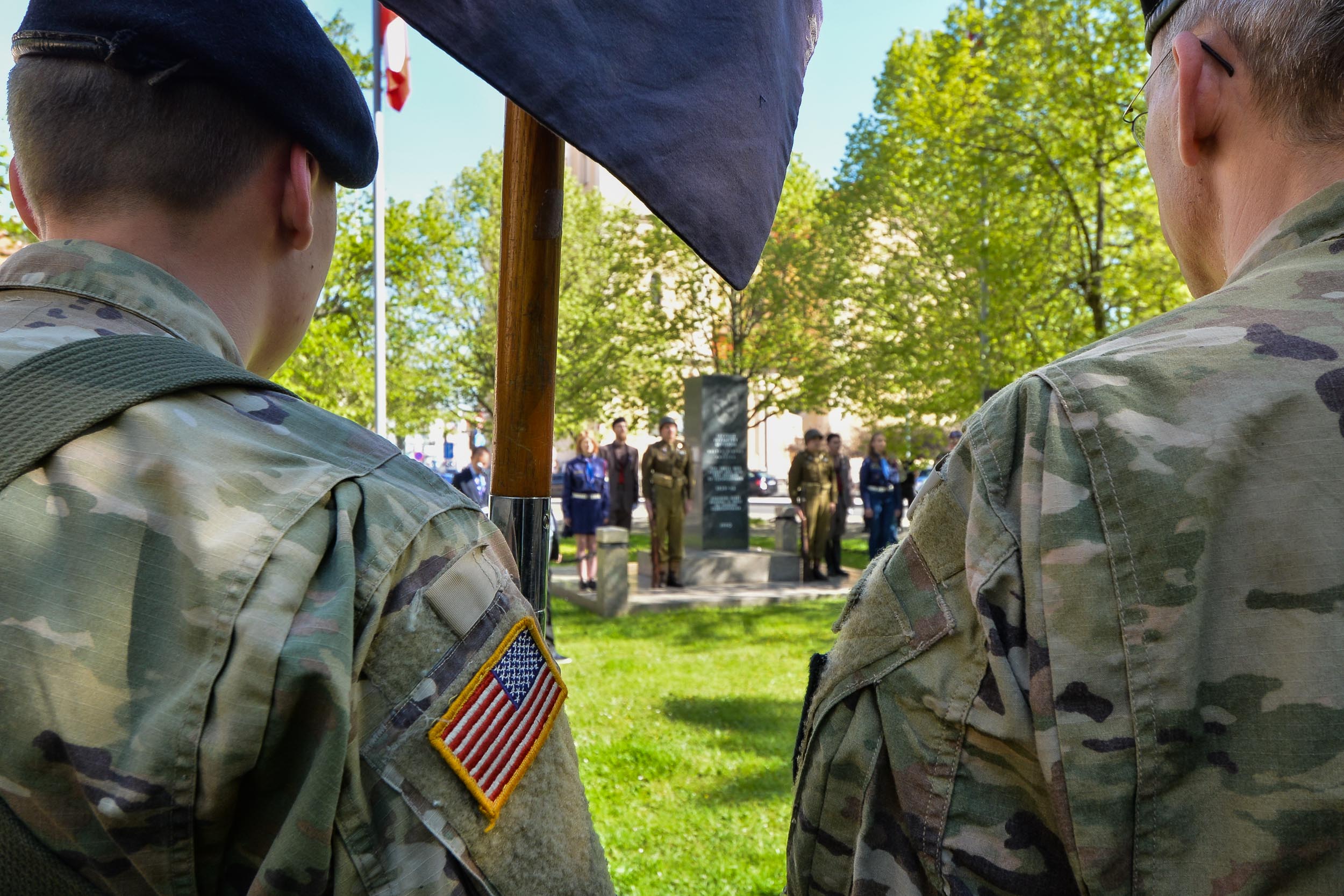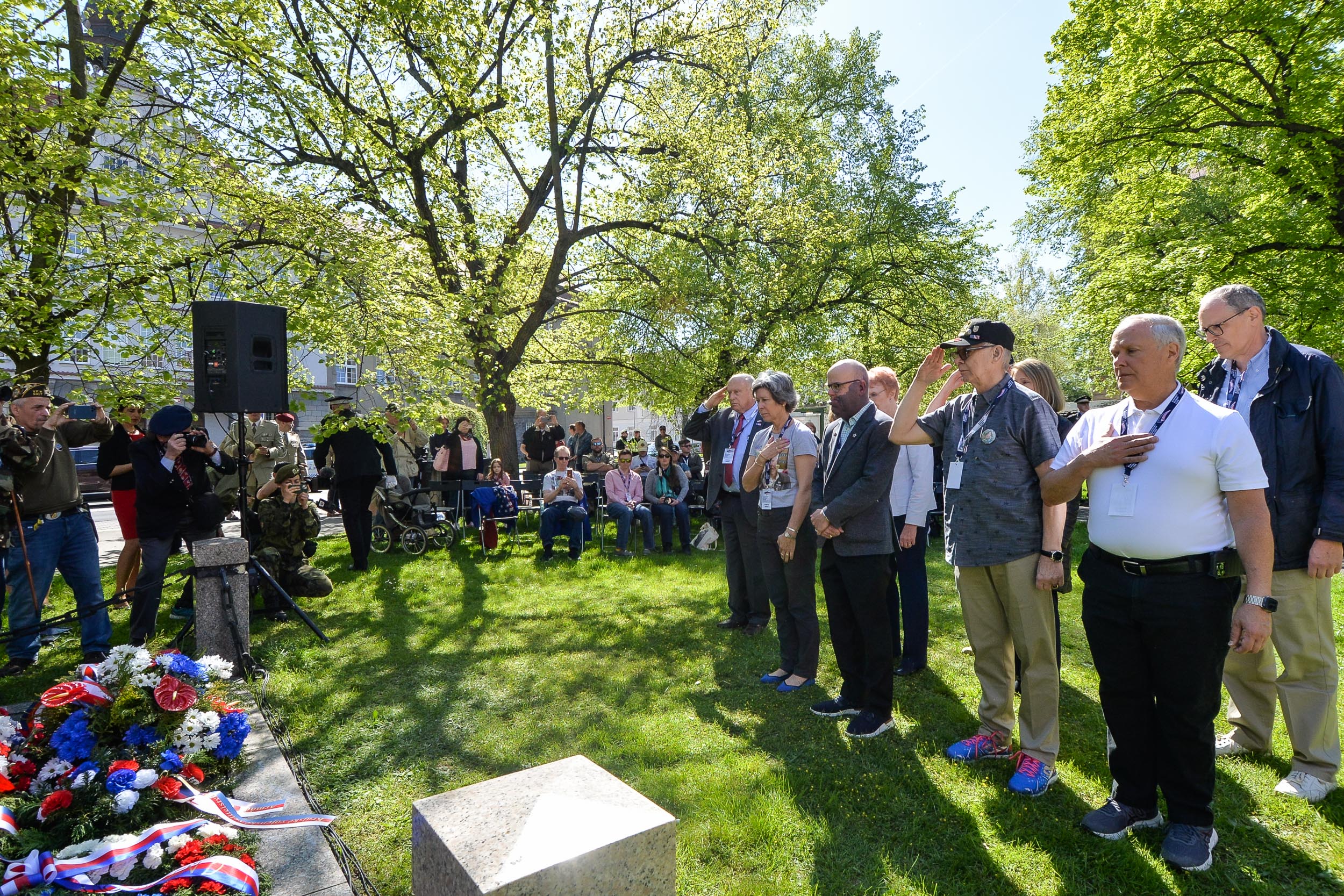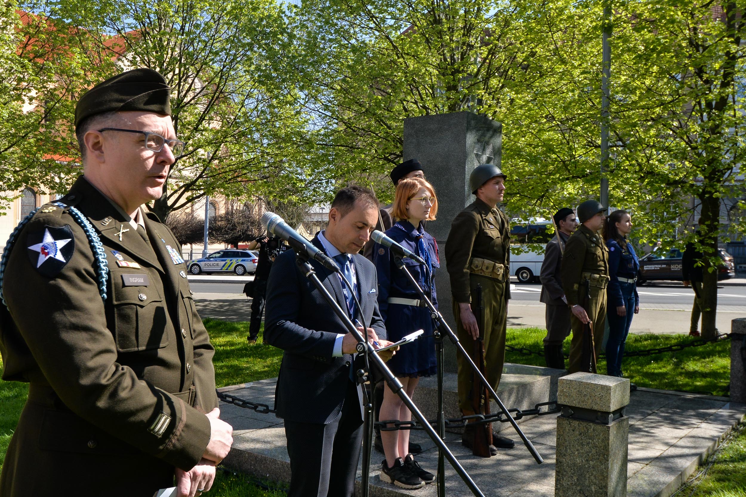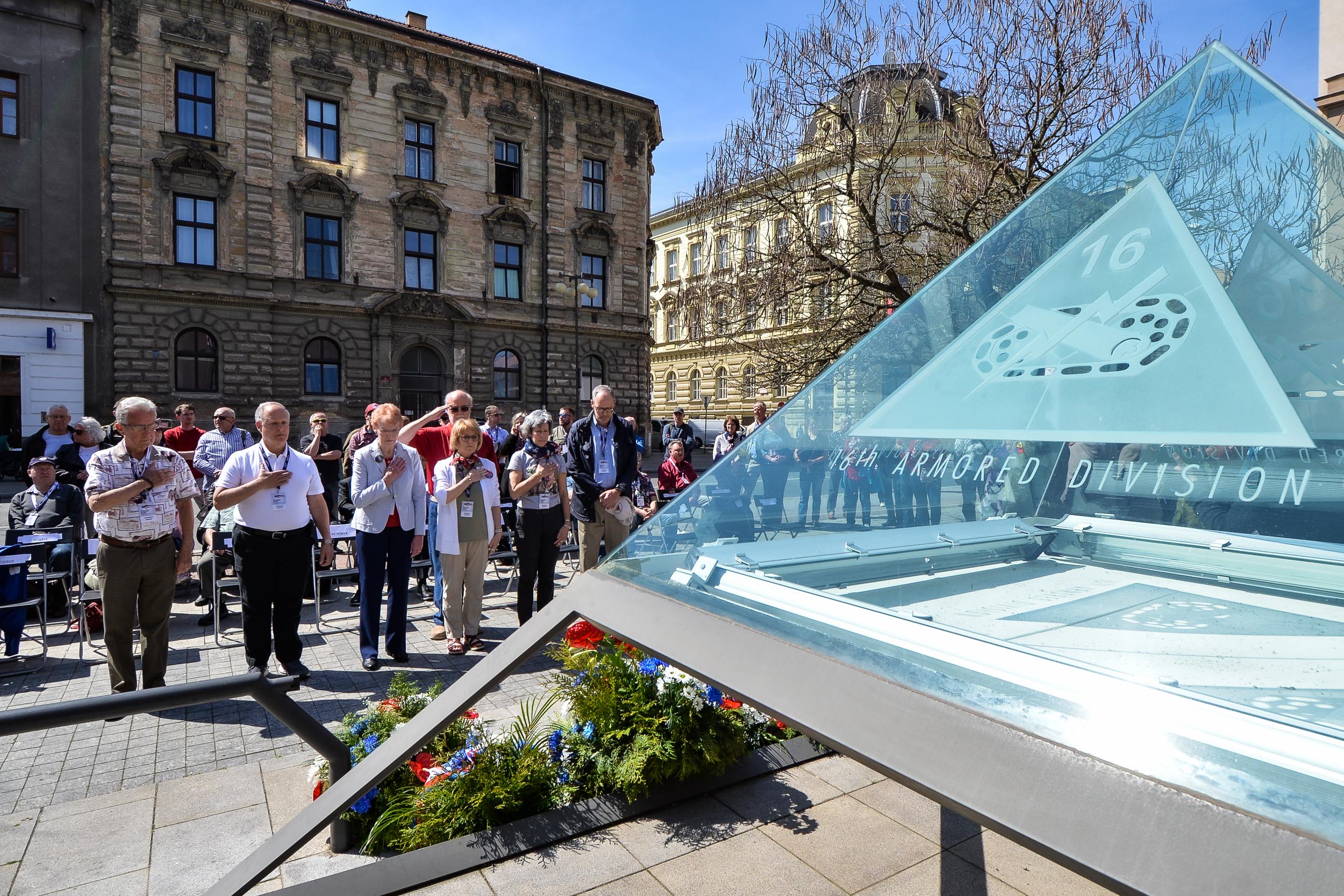 Zástupci města Plzně společně s příbuznými veteránů položili květiny nejprve v pátek dopoledne u pomníku 2. pěší divize Americké armády na Chodském náměstí. Na vzpomínkovém setkání promluvil Tom Duncan, syn zesnulého veterána Jamese H. Duncana a také Chris Ingram, vnuk zesnulého člena 2. pěší divize Armády Spojených států amerických Earla Ingrama. Chris Ingram připomněl, že se jeho dědeček do Plzně velmi rád vracel a popisoval, jak těžká cesta během války do západočeské metropole vedla. „Vyprávěl, jak se vylodili na pláži Omaha ve Francii a postupovali přes Německo, až do Plzně. Vždy říkal, že měl štěstí, že se dostal až sem, na rozdíl od dalších statisíců vojáků, kteří v tvrdých bojích padli. Na květnové dny roku 1945, které tu prožil, velice rád vzpomínal,“ sdělil mimo jiné Chris Ingram.