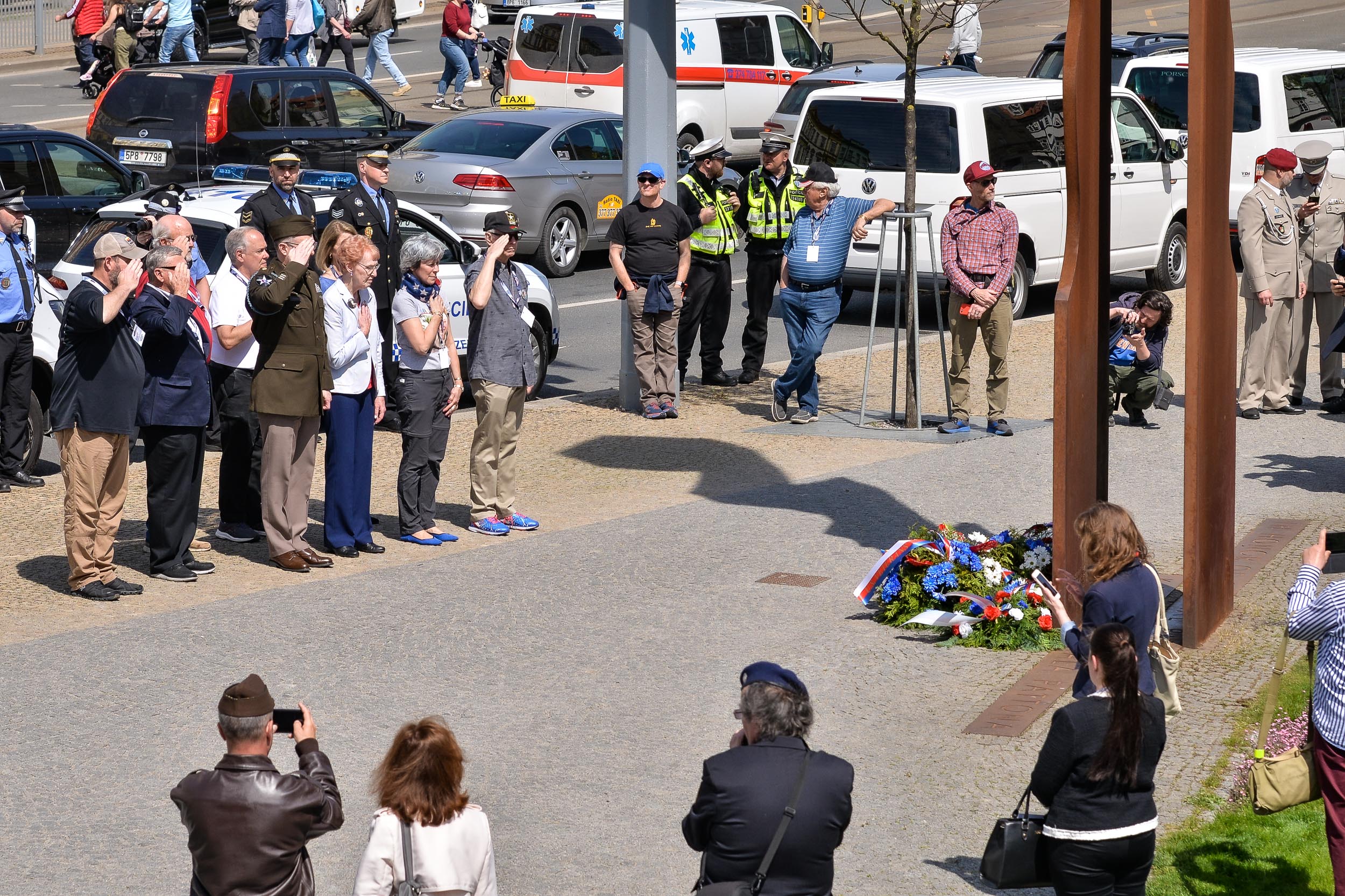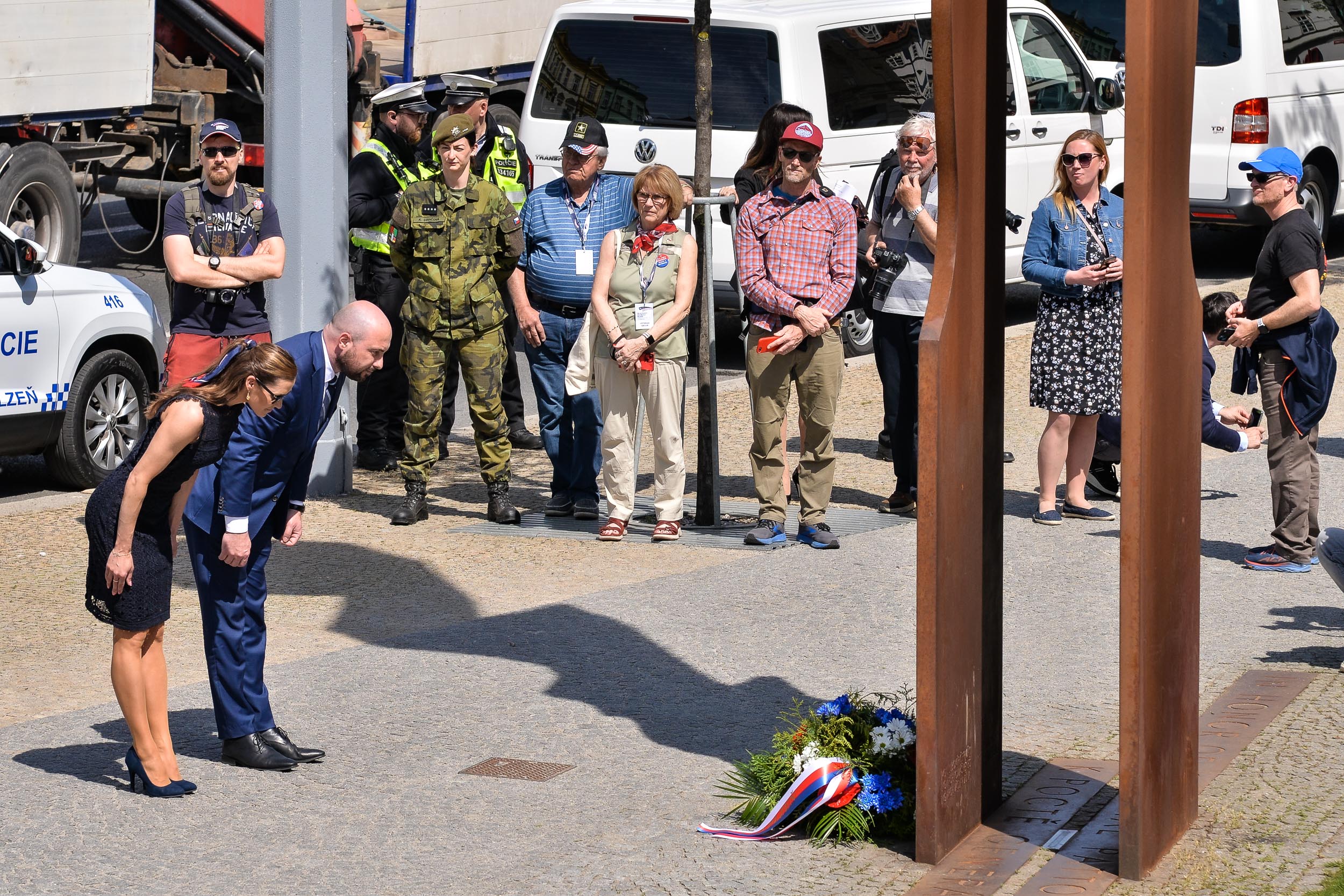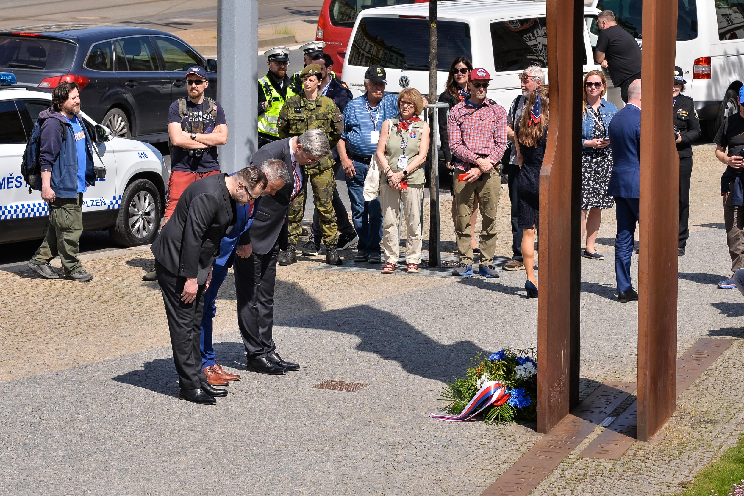 Osvobození Plzně si představitelé města a hosté připomněli také u památníku generála George S. Pattona, k němuž strážníci městské policie položili květiny.