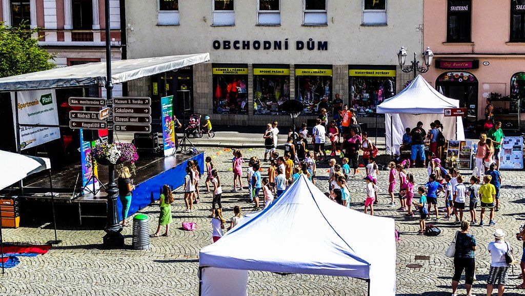 Letní SPORTMANIE Plzeň 2017 odstartovala tento týden putováním po čtyřech okresních městech Plzeňského kraje. V pondělí zavítala do Rokycan, kde přišlo na 2000 účastníků, bylo připraveno 10 stánků sportovišť a rozdáno bylo na 800 hracích karet. V úterý si mohly různé sportovní disciplíny i atrakce vyzkoušet děti v Domažlicích. „Na Domažlickém náměstí jsme napočítali zhruba 2500 účastníků, z toho bylo kolem 1200 dětí ze základních škol, rozdali jsme 950 hracích karet. Celkem jsme s místními kluby připravili 11 stanovišť, nechyběly sedmimílové boty, fotbal, basketbal, volejbal, atletika, mobilní lezecká stěna, slack line, predator junior, judo i třeba jóga pro děti,“ přiblížil Filip Marian z Odboru sportu Magistrátu města Plzně, který projekt připravuje.