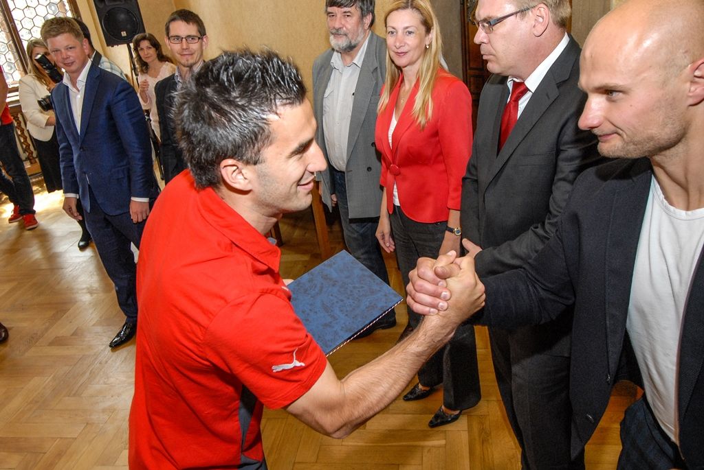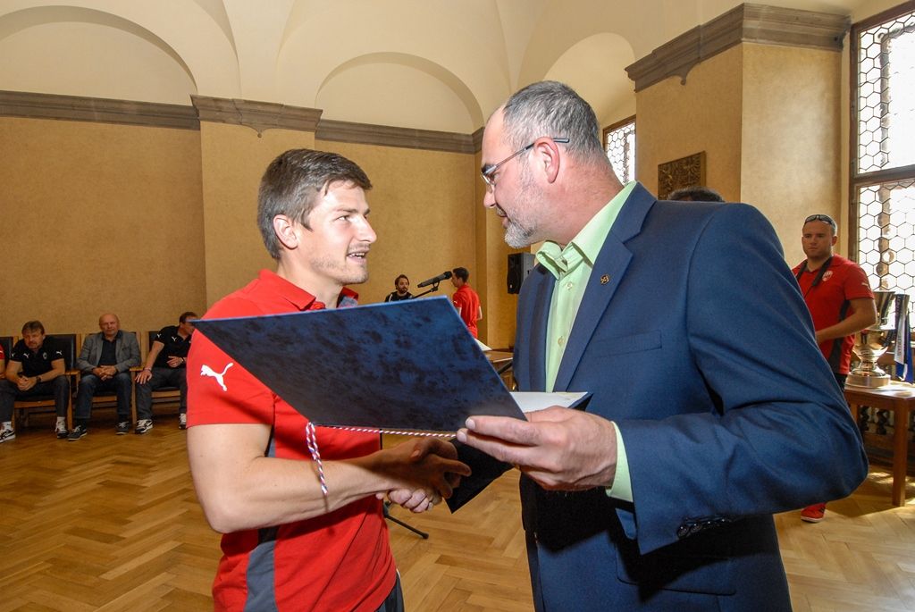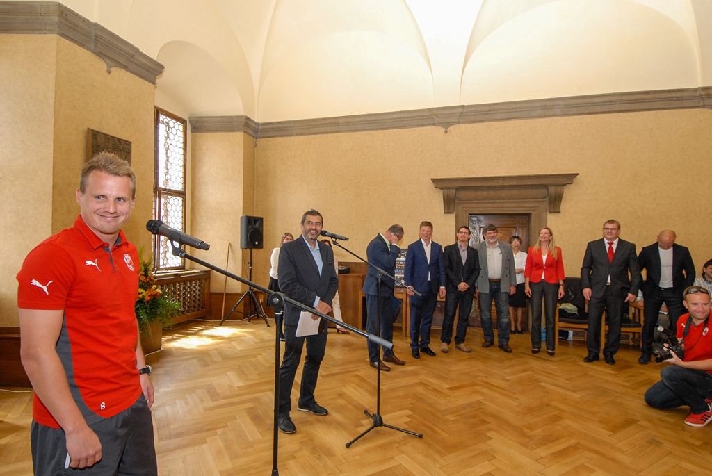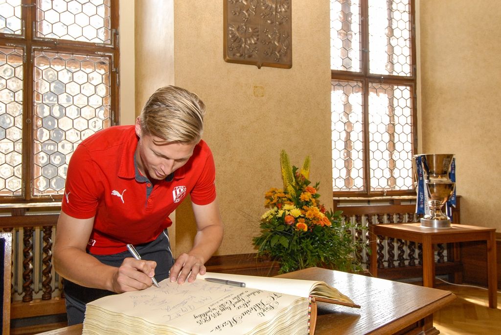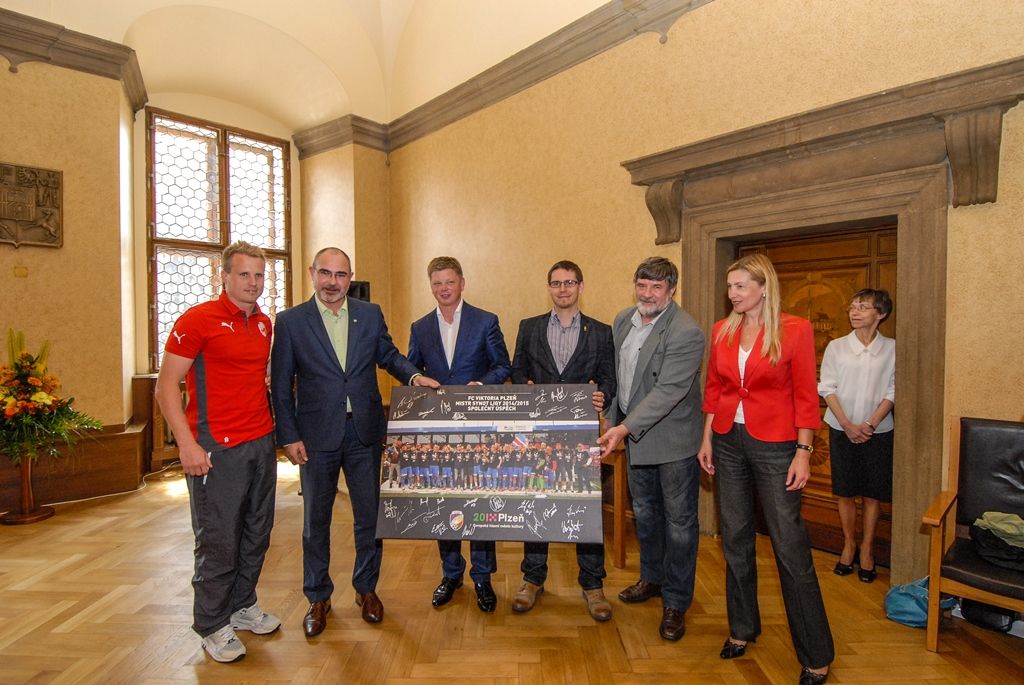 Primátor města Plzně Martin Zrzavecký a jeho náměstci i radní přijali dnes hráče a vedení klubu FC Viktoria Plzeň. Členům úspěšného plzeňského týmu, jenž nedávno získal již třetí mistrovský titul a díky tomu opět stojí před branou Ligy mistrů, zástupci města poděkovali a předali pamětní listy. Setkání předcházel podpis smlouvy, díky níž letos dostane FC Viktoria Plzeň na své mládežnické oddíly s více než 350 dětmi a mladými lidmi 1,3 milionu korun.