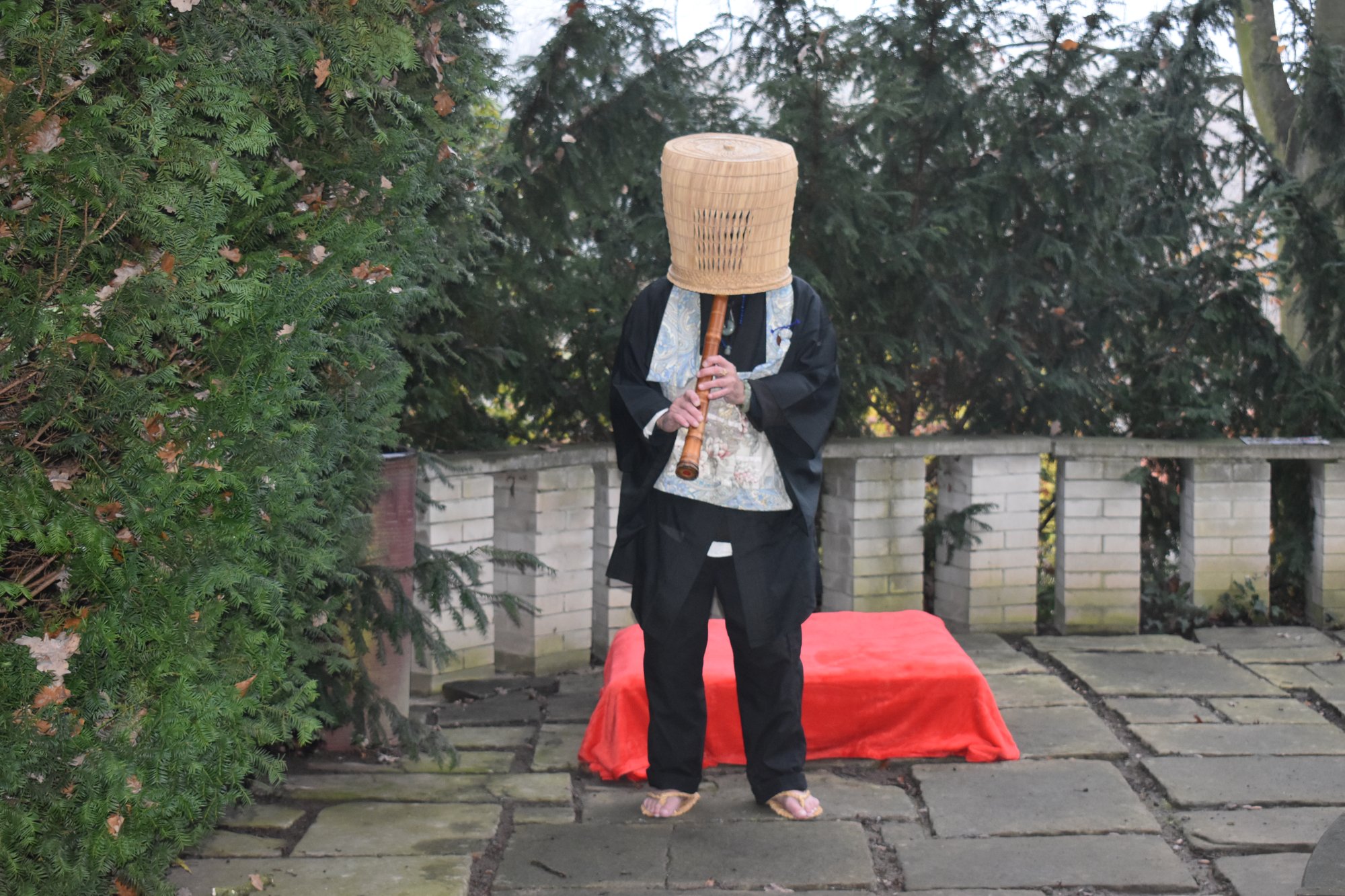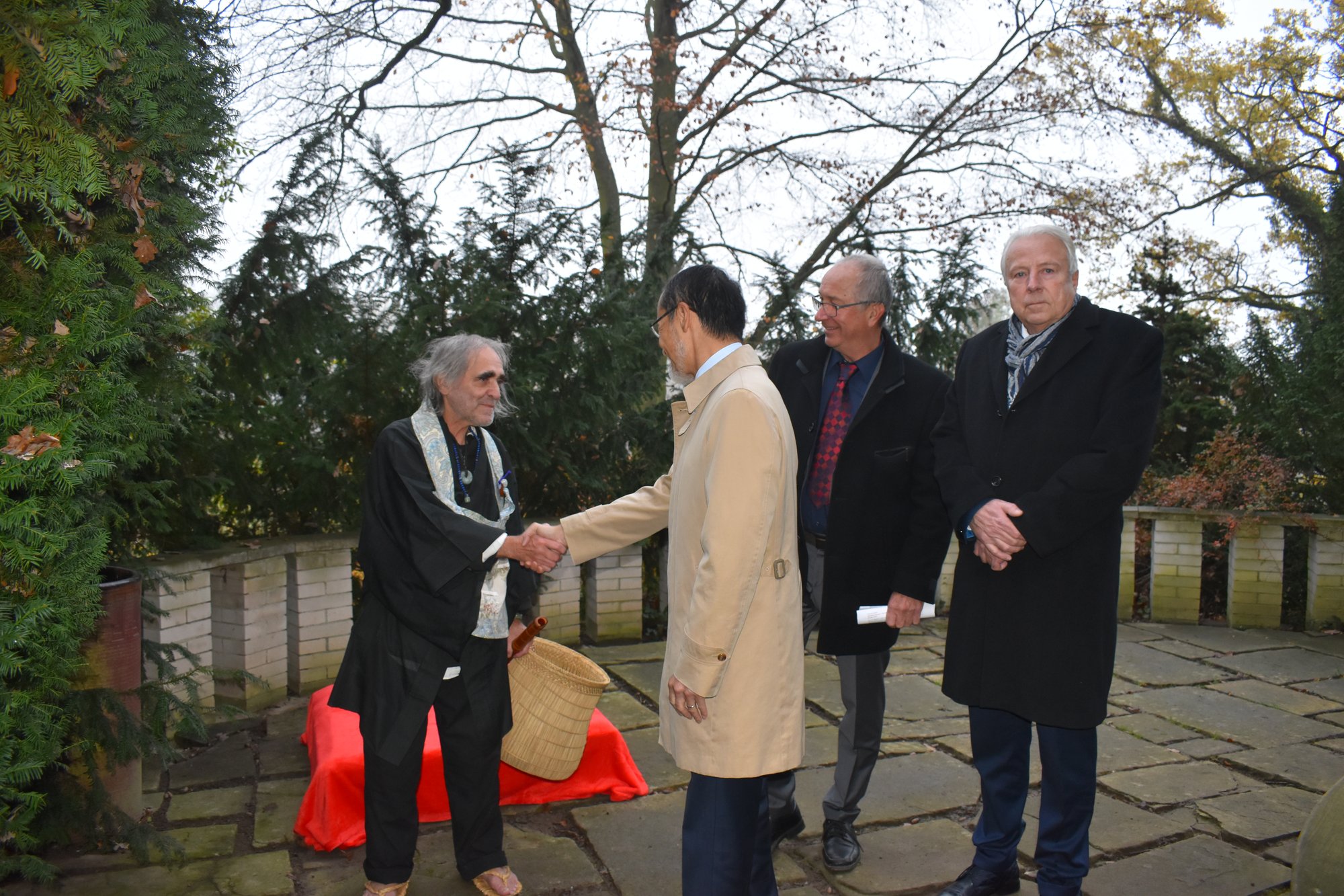 V zoo návštěvu přivítal ředitel zahrady Jiří Trávníček s botanickým náměstkem Tomášem Pešem. O hudební doprovod se postaral český etnomuzikolog a hudební skladatel Vlastislav Matoušek, jenž v roce 1996 studoval v Tokiu hru na šakuhači a japonskou tradiční hudbu. Je nositelem Řádu vycházejícího slunce, který letos obdržel od japonského císaře. Jedná se o třetí nejvyšší řád, který byl původně udělován pouze japonským mužům, od roku 1981 jej mohou získat i cizí státní příslušníci. Šakuhači je podélná hranová flétna v podobě otevřené trubice z masivního bambusu s pěti tónovými otvory. Má dlouhou historii, do Japonska byla uvedena z Číny v 8. století jako jeden z palácových nástrojů orchestru gagaku. Hlubším laděním mnohem intenzivněji stimuluje mysl a lépe tak navazuje stav meditace.