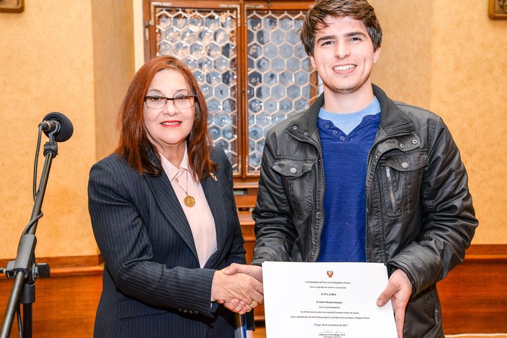 „Jsem potěšena, že velvyslanectví podporuje touto soutěží naše studenty, aby se učili o historii, literatuře a kultuře krásné země, jíž Peru bezpochyby je, a aby si rozšiřovali jazykové znalosti a předávali své vědomosti dál,“ uvedla při předávání diplomů náměstkyně Eva Herinková. Poděkovala organizátorům soutěže za její uspořádání a popřála všem účastníkům mnoho úspěchů v dalším studiu.