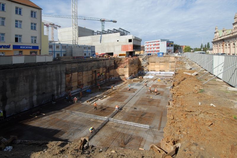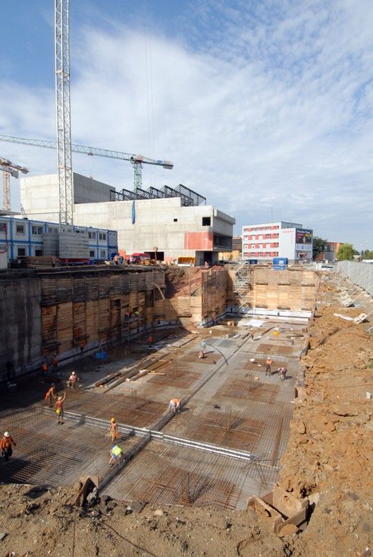 Součástí stavby je parkovací dům, pro který byla vyhloubena zhruba jedenáctimetrová jáma. Tady stavaři postupně betonují základovou desku objektu.