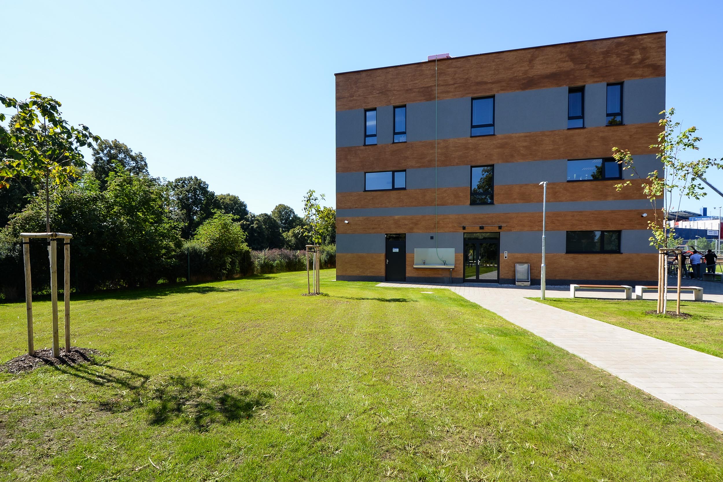 - Celý třípodlažní objekt je zastřežen extenzivní vegetační plochou střechou.